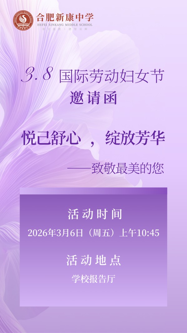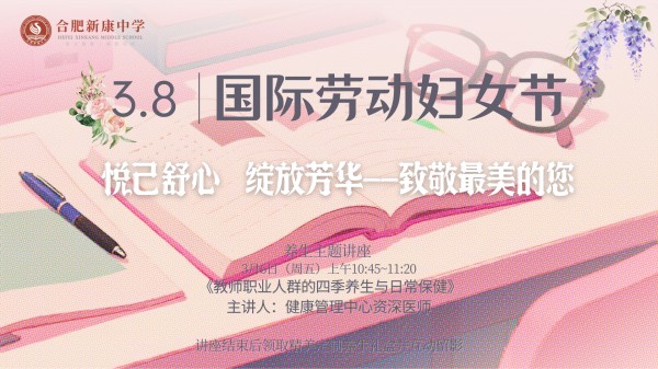 春风有信,花开有期。为庆祝第116个“三八”国际劳动妇女节,合肥新康中学工会精心策划了一场以“悦己舒心,绽放芳华”为主题的暖心活动,为全体女教职工送上一份专属的健康礼遇与节日祝福。