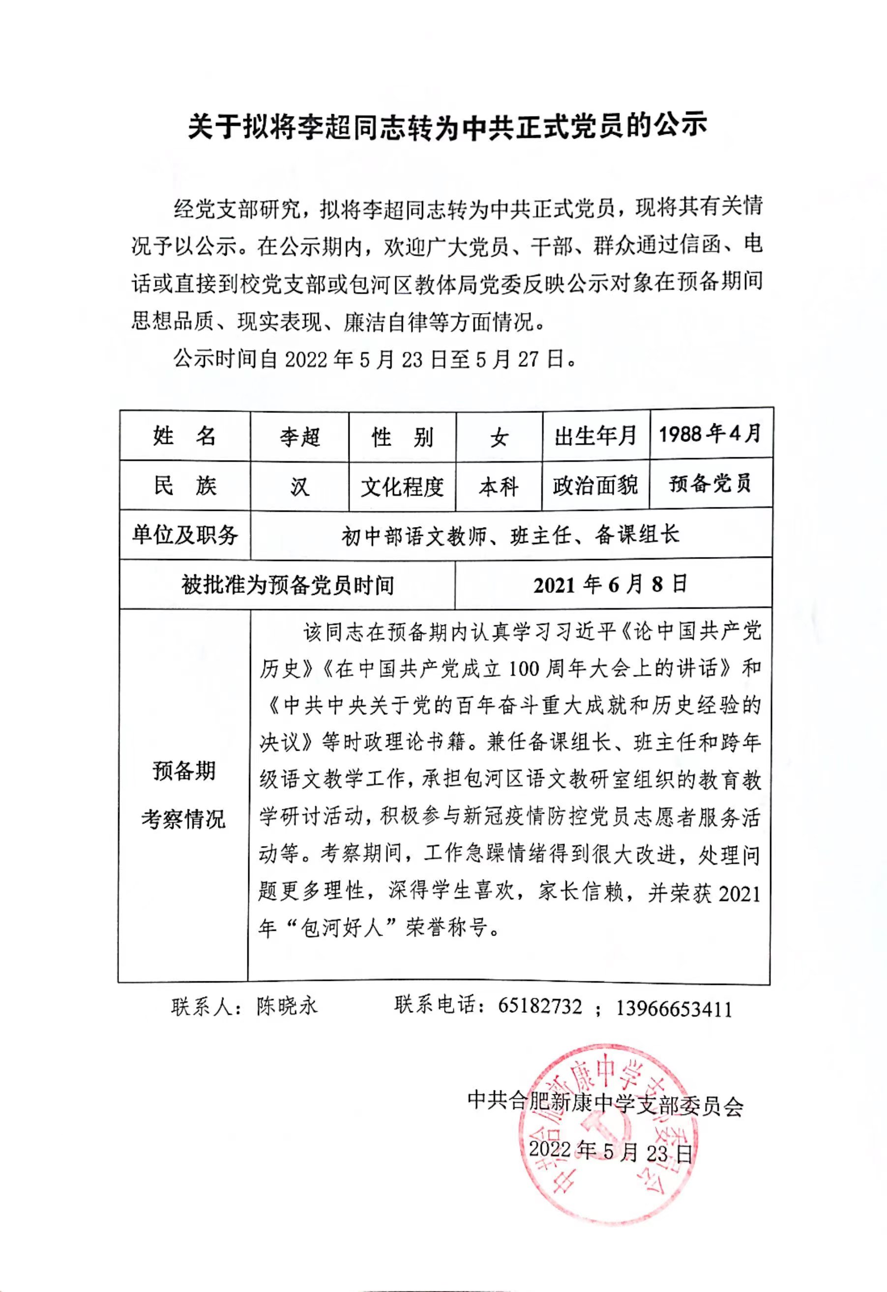 关于拟将李超同志转为中共正式党员的公示