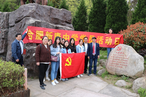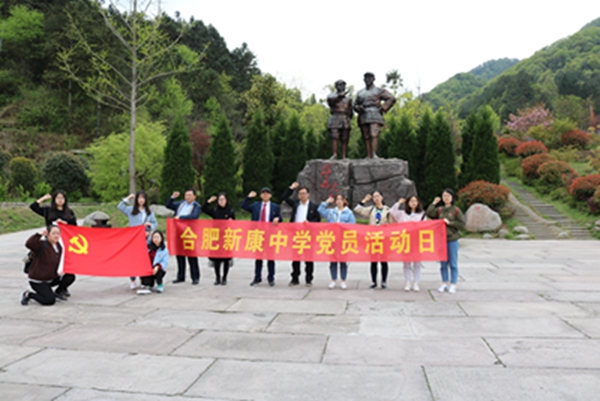 在刘邓大军前线指挥部塑像前,我校党员同志佩戴党员徽章,右手握拳,面对党旗,集体重新宣读入党誓词。提醒自己时刻不忘初心,肩负教育使命,提升教学水准,打造新康品牌。