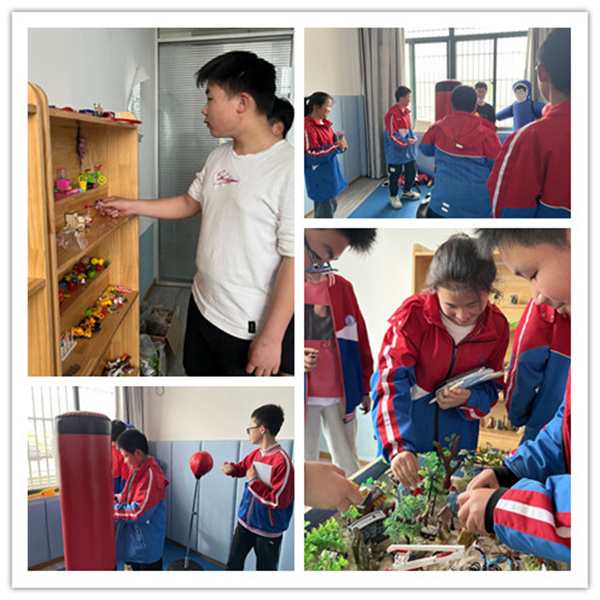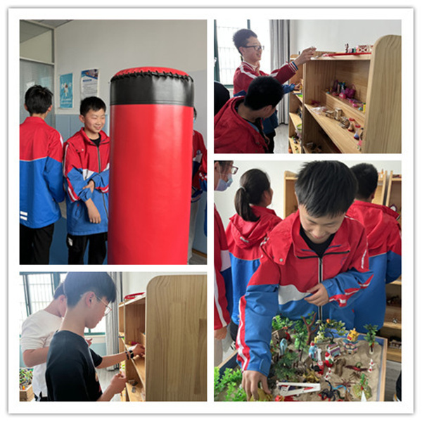 最后,翁老师带领学生去了沙盘室和宣泄室,并告诉学生们,情绪的压力可以通过很多种形式去表达,比如倾诉、画画、听音乐,看场球赛等等,当我们有不好的情绪时,不是去压抑它,而是去面对它,调整它,做情绪的主人,通过不同的形式让情绪得到疏解。