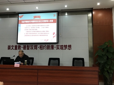 2018年1月18日下午,我校督导专员兼第一书记刘建国为学校的全体党员开展学习贯彻党的十九大报告专题辅导活动。会议由学校党支部副书记、校长许苏美主持,学校党支部书记、董事长王俊等校领导及全体党员出席会议。
