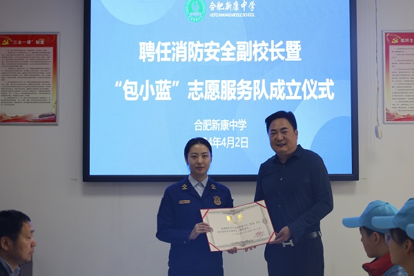 为进一步构建学校、家庭、社会、消防“四位一体”的消防宣传教育机制,增强师生消防安全意识,提高师生自防自救能力。4月2日上午,合肥新康中学联合包河区教体局、区消防救援大队,开展了聘任消防安全副校长暨“包小蓝”志愿服务队成立仪式。
