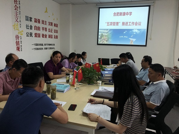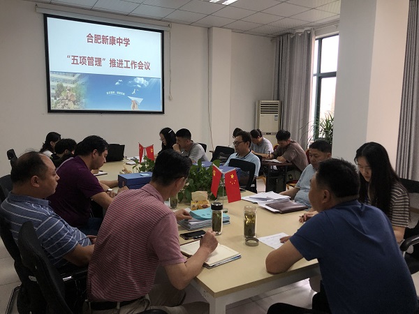 为贯彻落实教育部关于中小学生作业、睡眠、手机、读物和体质等“五项管理”规定,营造有利于学生健康成长的良好环境,6月16日,合肥新康中学召开“五项管理”推进工作会议。会议由王俊校长主持,市教育局督导顾明书记、校领导班子及全体中层干部参加会议。