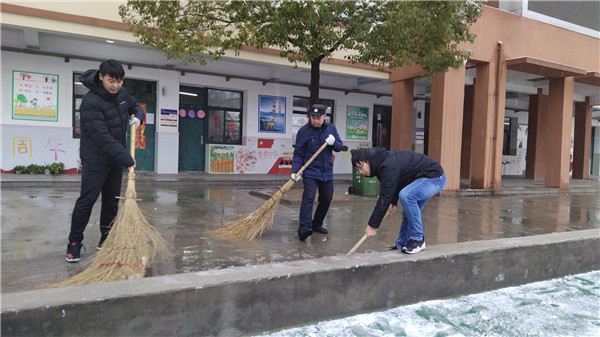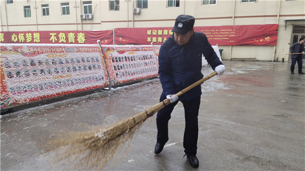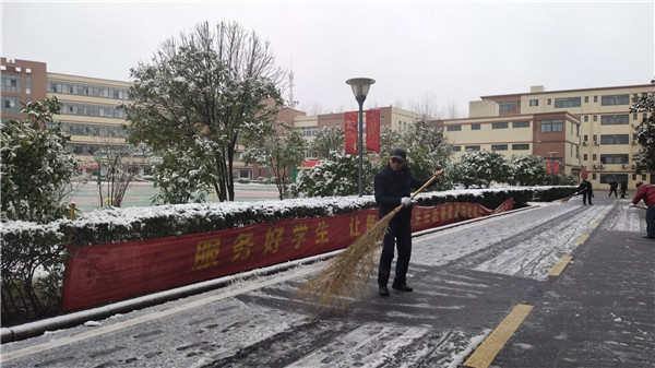 早晨7:20左右,初中部徐学法校长查看完学生晨读之后,第一个拿起扫把开始清扫积雪,门卫盛师傅随后加入,陈晓永副书记给他俩拍下最早最美的背影。后勤卫志荣副主任开始分发工具,后勤宇汝章、罗锋两位副主任,张伟华、孙鹏老师,相继加入清理初中部学生公寓主干道,成为一道亮丽的风景线。队伍在不断扩大,高中部李韦、魏鑫、王锐和樊浩四位老师积极行动起来,开始清扫高中部教学楼至食堂主干道。随后,徐校长、龚校长、余成祥、孙鹏和王林老师又转战食堂门口至初中部教学楼主干道,余成祥还在教学楼东侧拉起警戒线。高中部韩丽、程小旺和范先云三位生活老师清理学生宿舍门口积雪,初中部张苹等生活老师彻底清扫宿舍楼梯道积雪,并且用干拖把拖干地面,防止楼梯结冰。