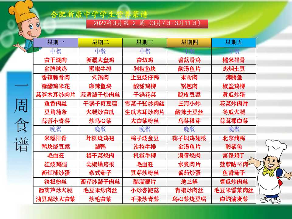 合肥新康中学3.7-3.11一周学生菜单