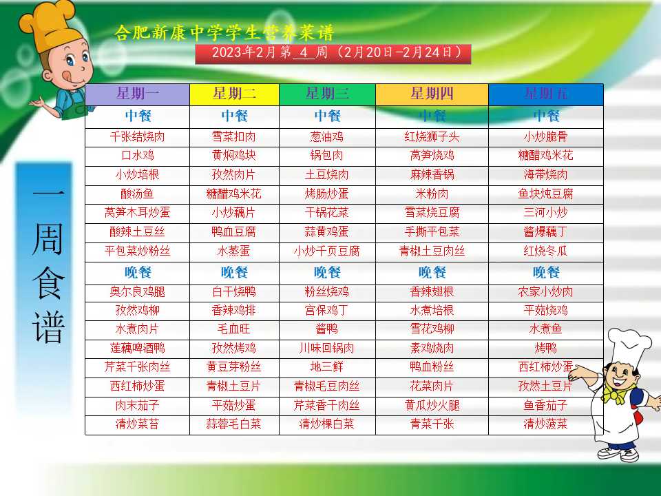 合肥新康中学2.20——2.24一周学生菜单