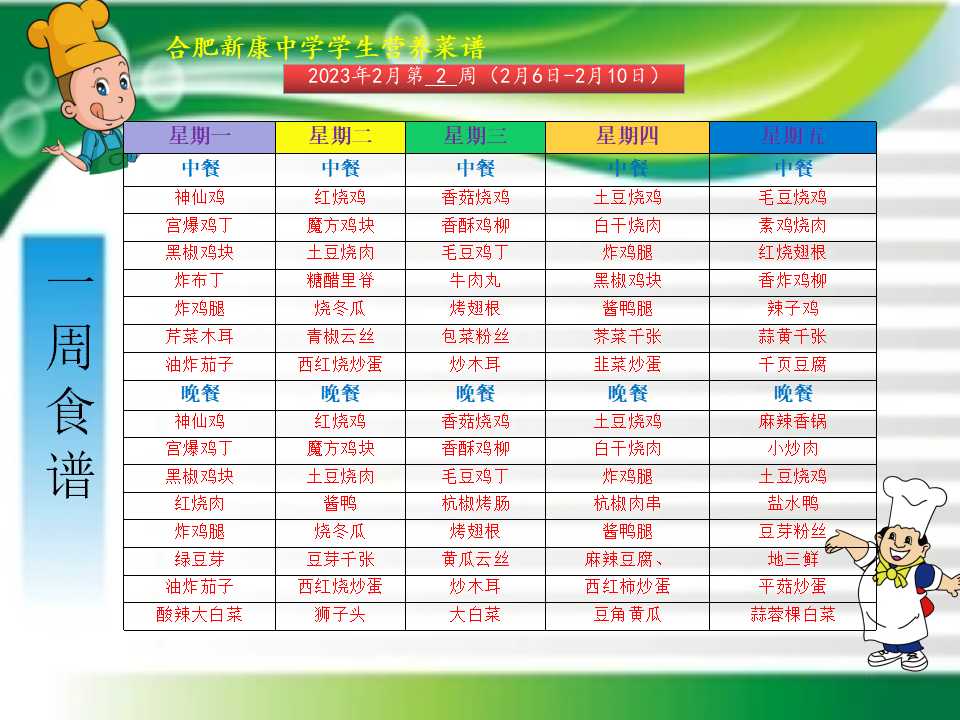 合肥新康中学2.6——2.10一周学生菜单