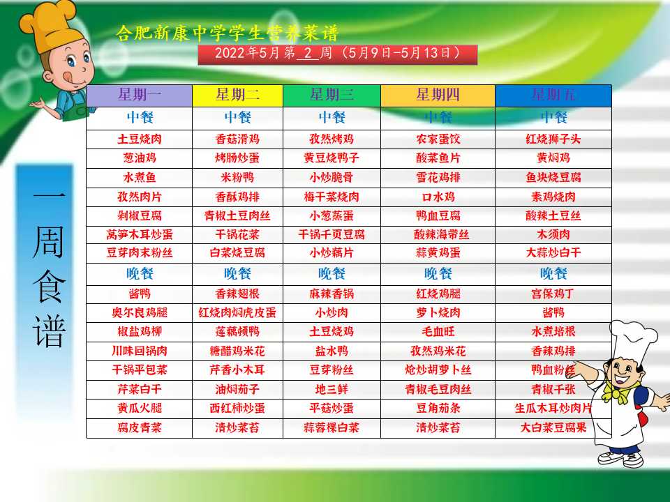 合肥新康中学5.9-5.13一周学生菜单