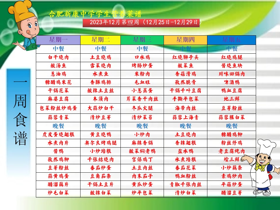 合肥新康中学12.25——12.29一周学生菜单