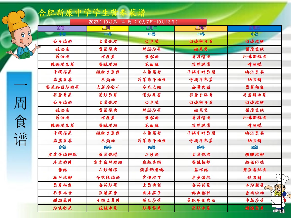 合肥新康中学10.7——10.13一周学生菜单