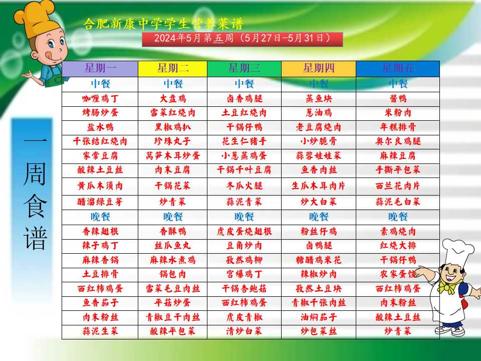 合肥新康中学5.27——5.31一周学生菜单