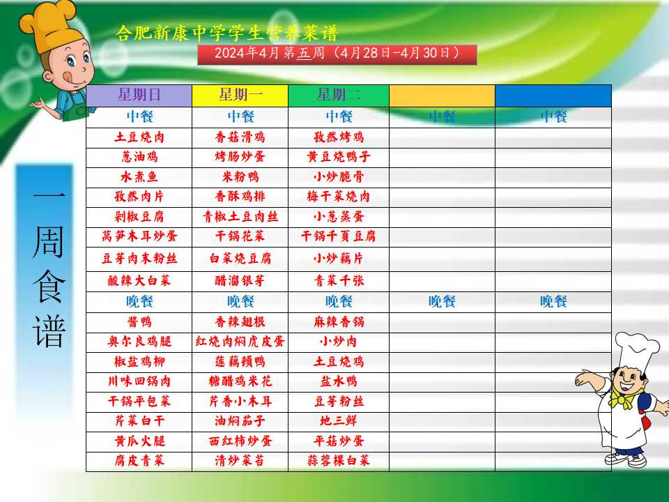 合肥新康中学4.28——4.30一周学生菜单