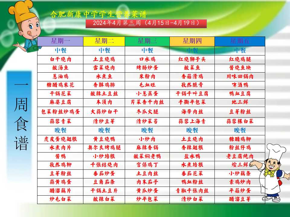 合肥新康中学4.15——4.19一周学生菜单