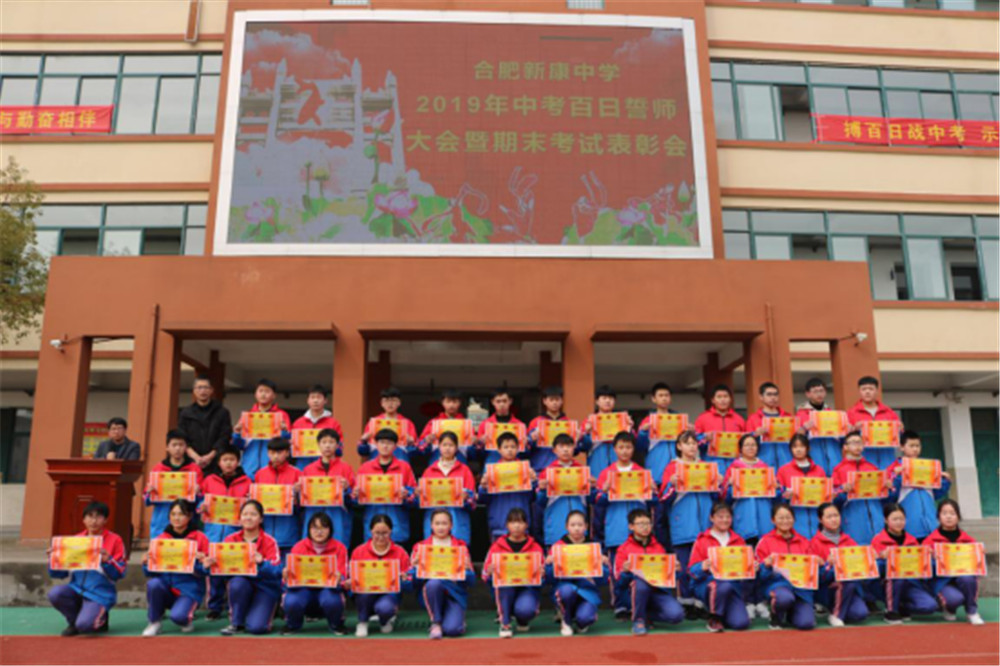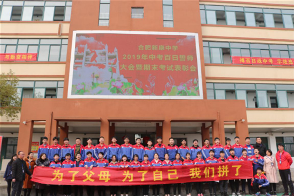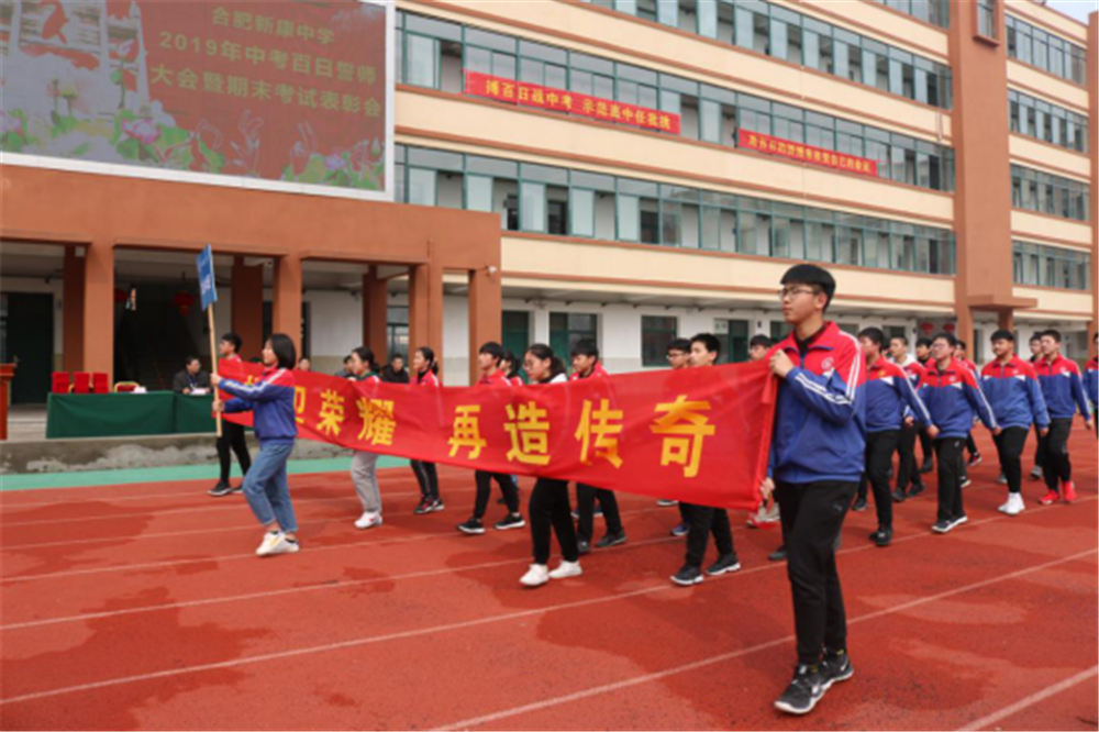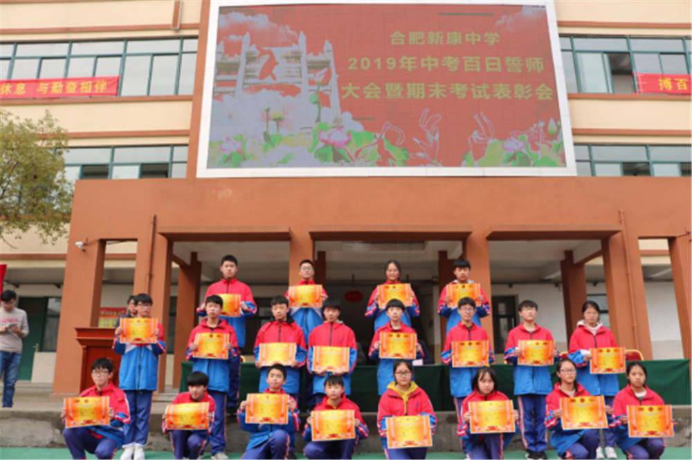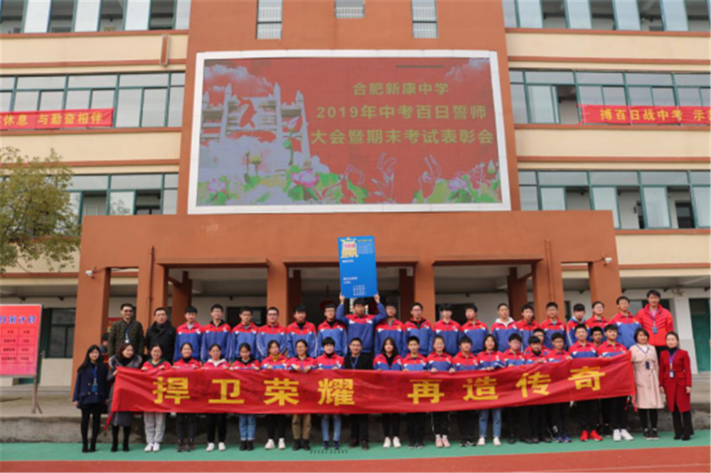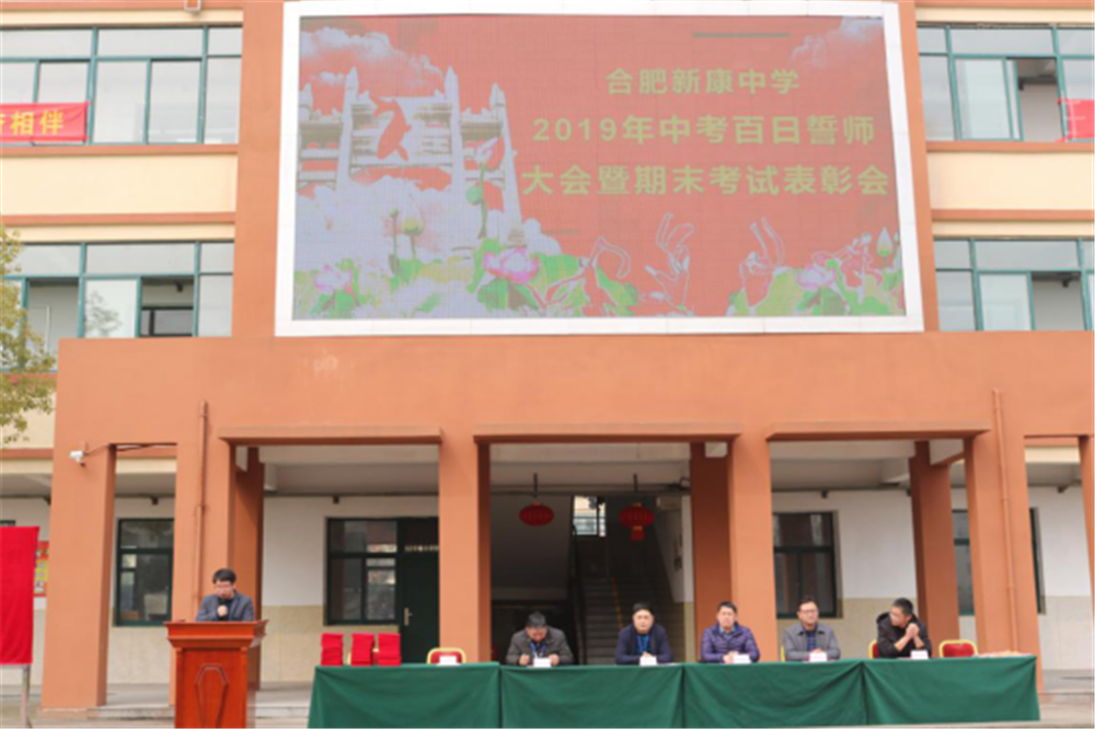 阳春三月,万物逢春,在这个充满希望的季节里,合肥新康中学初中部于3月6日下午隆重举行2019届毕业班百日誓师大会暨期末考试表彰会。大会由肖遥老师主持,合肥新康中学董事长王俊、初中部校长徐学法、副校长李森、龚红卫等领导在主席台就坐。