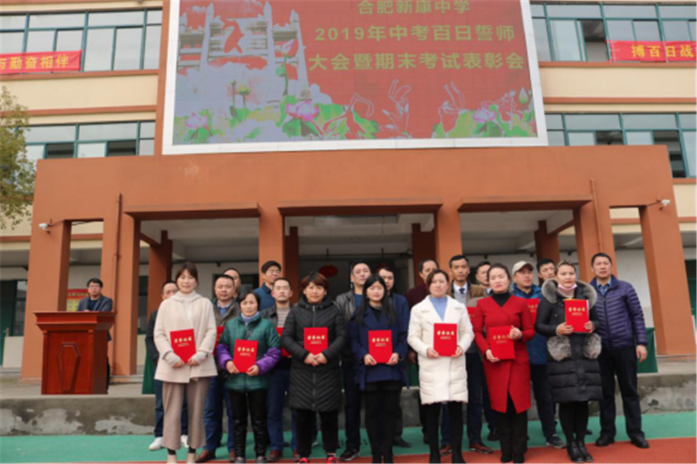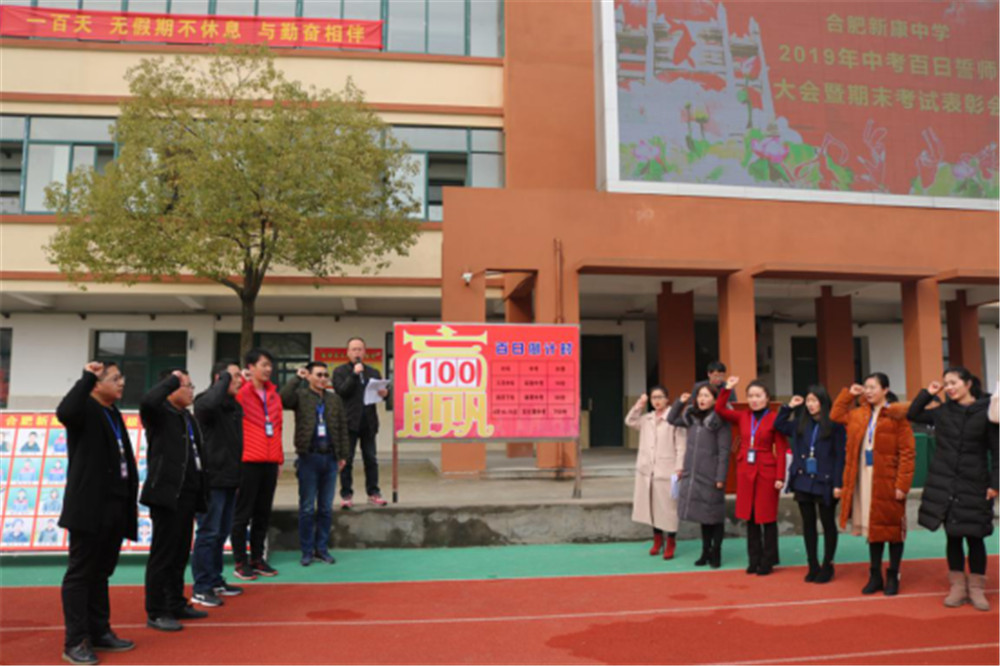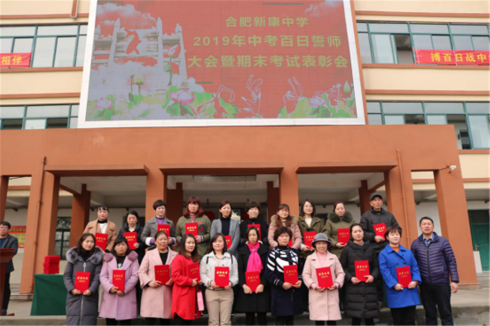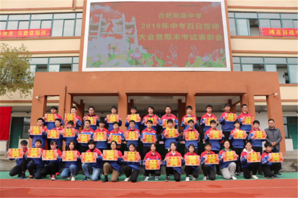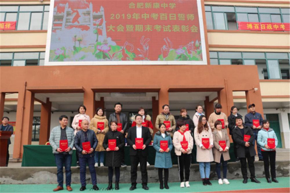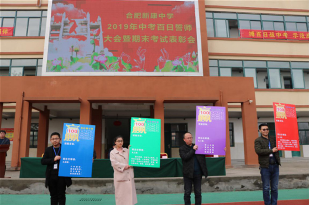 阳春三月,万物逢春,在这个充满希望的季节里,合肥新康中学初中部于3月6日下午隆重举行2019届毕业班百日誓师大会暨期末考试表彰会。大会由肖遥老师主持,合肥新康中学董事长王俊、初中部校长徐学法、副校长李森、龚红卫等领导在主席台就坐。