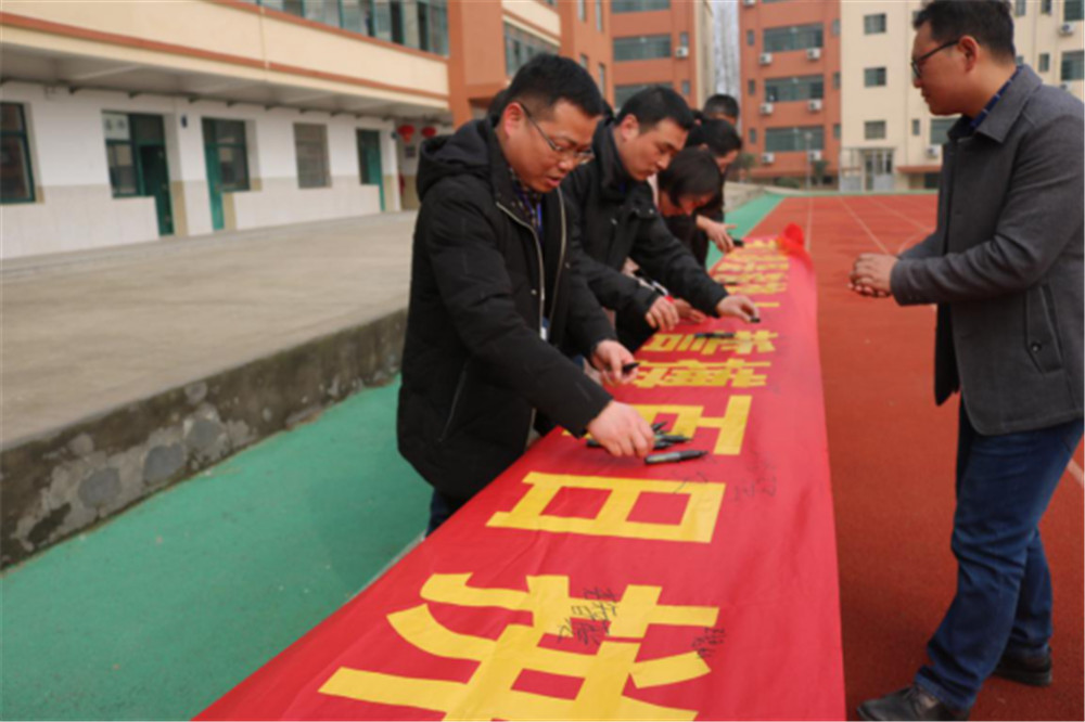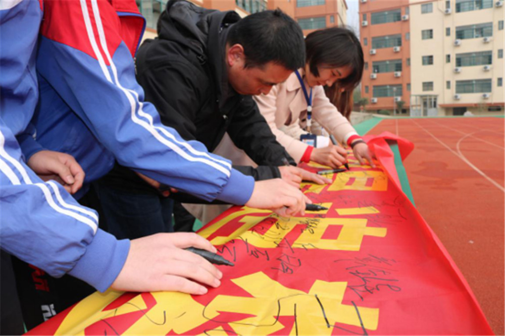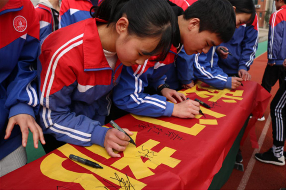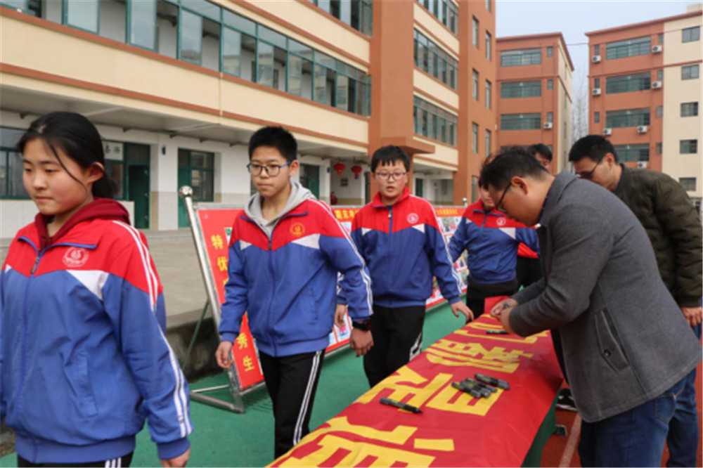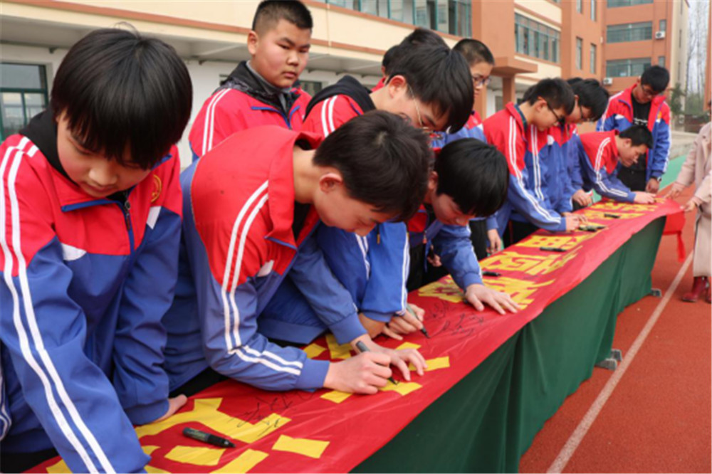 随后,毕业班各班学生依次上台,在自己的班级的中考目标条幅上签下自己的姓名,以表示自己为中考奋战的决心。