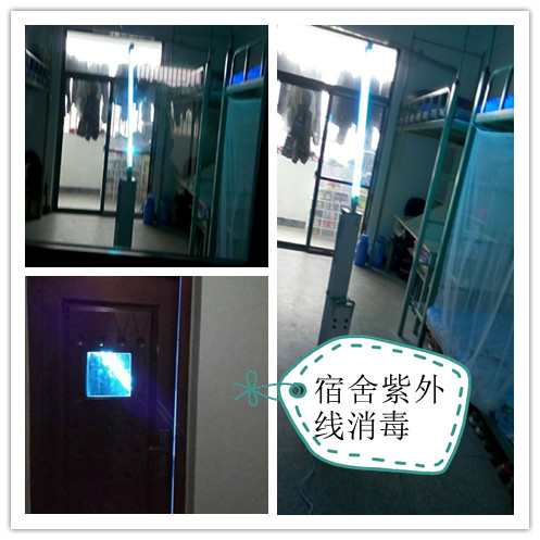 同时,我校购买了84消毒液,按照配比,对教室地面、桌面、门把手等学生经常接触到的区域进行消毒。生活老师用喷壶将配比好的消毒液,喷洒在走廊、卫生间、洗澡间、洗漱间等,开展清洁消毒工作。接着又采购紫外线消毒灯,利用学生不在宿舍期间,集中消毒,开窗换气。