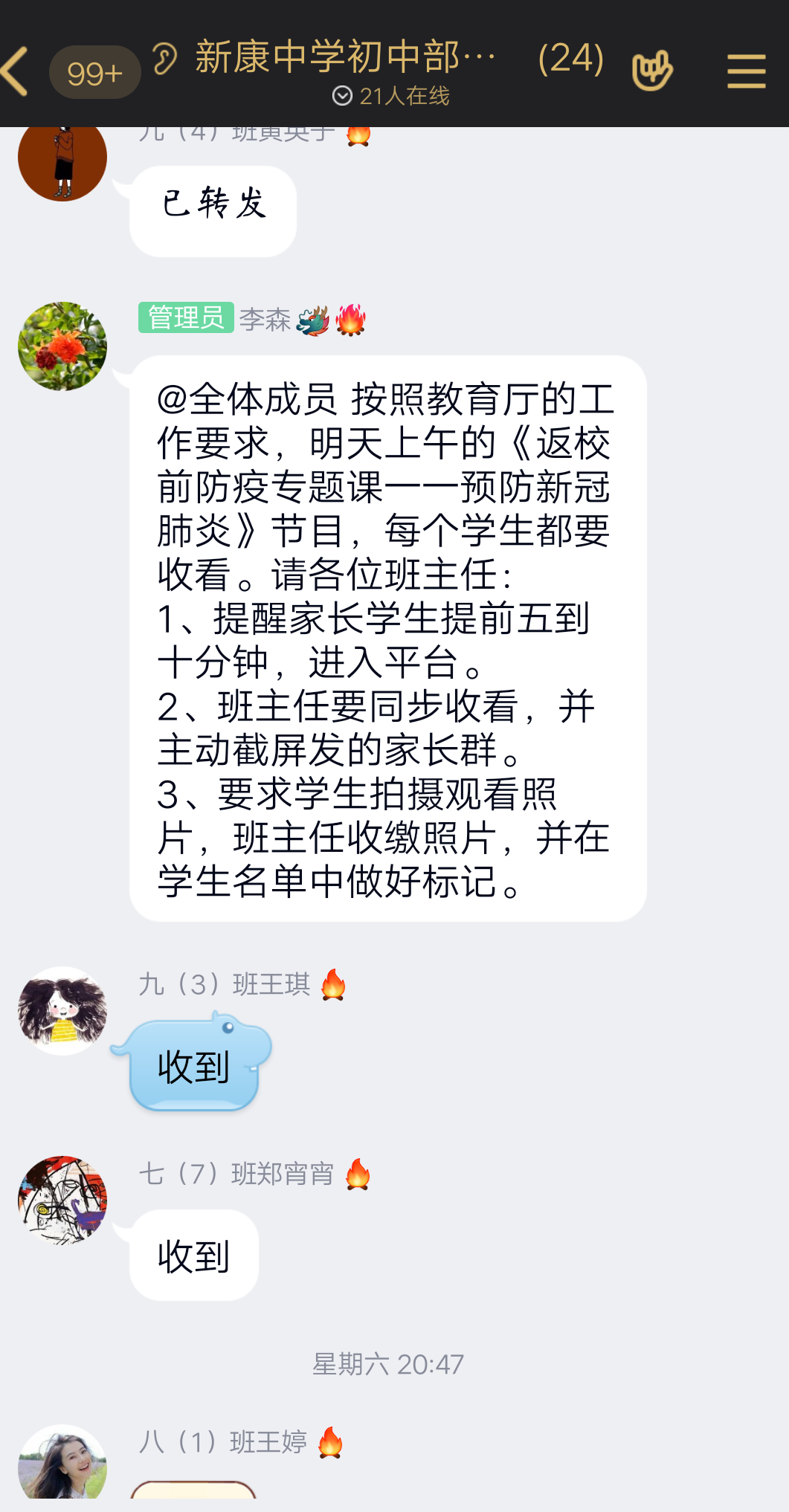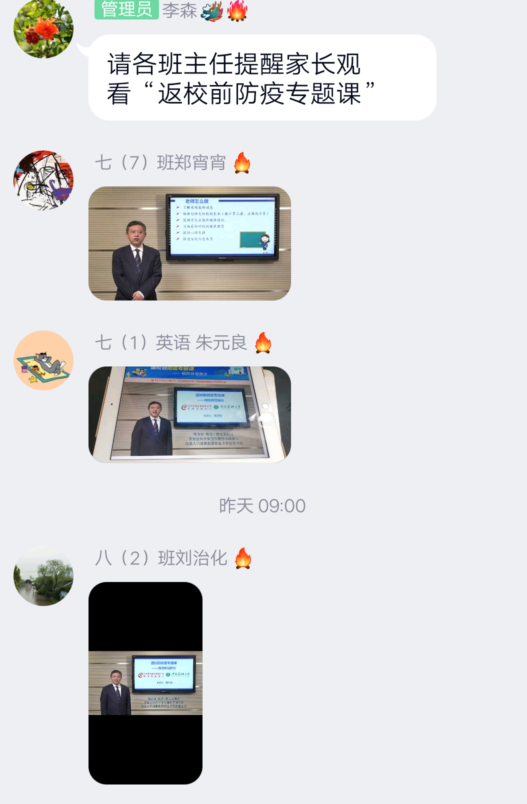 自从接到合肥市教育局关于组织收看返校前防疫专题课的通知,我校德育处积极行动起来,多次发送通知,提醒学生、家长和老师收看防疫专题课程。德育处在老师群里做了提醒和布置,各班主任也将收看方式和时间,提前告知学生和家长,做了细致的安排。