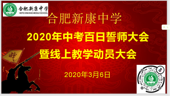 大家好! 好久不见,很是想念大家。正常情况下,此刻的你们正坐在美丽的新康校园里沐浴着知识的阳光。然而一场突如其来的疫情打乱了我们所有人的生活节奏。2020年的春天注定要成为我们一生难忘的记忆。其实我们每个人的一生都会遇到很多未知的变化。古语云:既来之,则安之。无论遇到什么样的变化,我们都要学会适应变化、做好自己。人生道路亦是如此,有春光明媚、风和日丽,也有风雨交加、严寒酷暑;有平坦的道路,也有崎岖的小径。我们无法改变天气,无法改变外界的环境,唯有做好自己。疫情来临的时候,我和你们一样响应国家的号召首先做好自身的防控工作:少出门,勤洗手,出门带口罩。同时还要按照市区教育主管部门的要求做好学校的疫情防控工作。在做好学校疫情防控工作的同时,我最关心、最牵挂是孩子们在家的学习情况。对于线上教学工作,我们多次召开视频工作会议,制定了周密的教学计划、工作方案。新康的老师们还是那样特别能吃苦、特别能战斗、特别能奉献,他们不辞辛劳的备课、在线批改作业。他们的忘我工作得到了同学们和家长们的一致好评。大部分新康学子们能够按照学校和老师的要求认真在线上课、认真完成作业,但是我也了解到有少数同学做的还不够好,让我深感忧虑与不安。此次疫情对不自律的同学是一次巨大的考验与挑战。不自律的同学将是此次疫情最受影响的学生。自律的同学借此机会实现弯道超越的梦想,不自律的同学可能会拉大与别人的差距。鉴于此思考,在2020年中考之前100天之际,我们决定举行 “2020年中考百日誓师暨在线教学动员大会”,一是给毕业班同学加油鼓劲,呐喊助威,二是给全体同学就在家学习、在线学习作再次提醒、叮嘱。此次会议我们采用抖音直播的方式举行,这是开了合肥教育上的先河,也体现了我们的良苦用心。