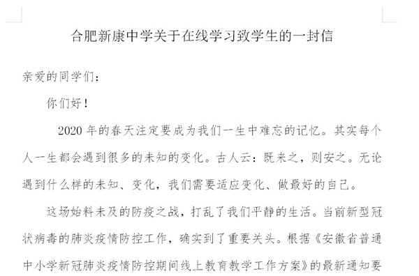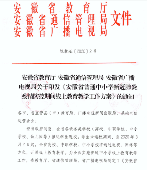根据《安徽省教育厅 安徽省通信管理局 安徽省广播电视局关于印发<安徽省普通中小学新冠肺炎疫情防控期间线上教育教学工作方案>的通知》皖教基〔2020〕2号文件精神,要求各校自2020年3月2日起通过电视、网络等开展线上教育教学。