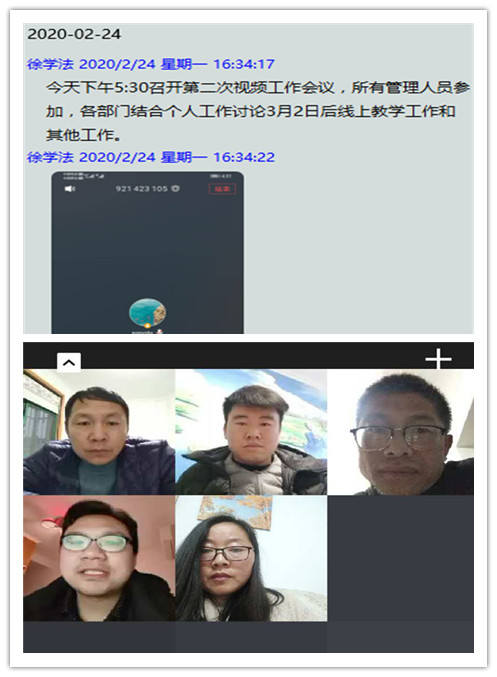 接到通知后,学校高度重视,并于2月24日、2月25日分别召开了初中部行政视频会议、备课组长视频会议,为3月2日后的线上教学工作做准备。行政会上徐校长布置教务处制定第二阶段的线上教学实施方案,在线上教学细节方面要更加完善,如学生线上作业打卡、老师在线批阅、课后及时跟踪等都做了明确要求,布置德育处制定“致学生的一封信”,并做好每日学生疫情时期的零报告、日报告以及学生的外出轨迹情况。为了给后期开学工作做好准备,对于防护用品、校园消毒等方面徐校长都做了具体要求。
