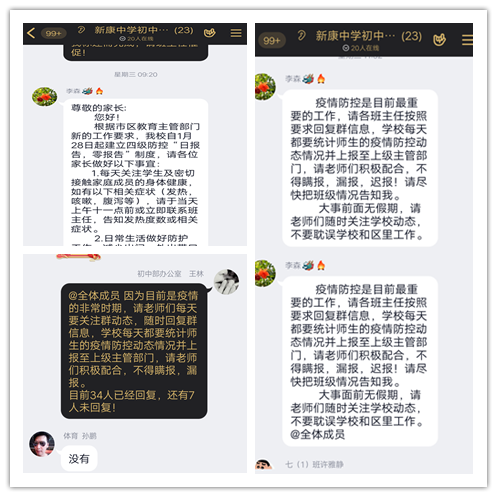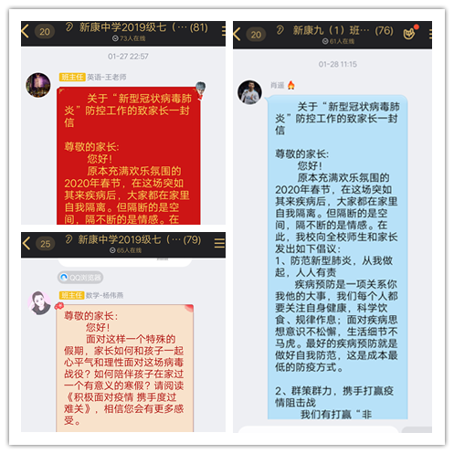 我校领导时刻关注疫情发展,时刻保持警惕,要求各班主任通过家校QQ群向家长们推送相关宣传文件,已转发区省教育厅发布的《致全省广大学生和家长的一封信》,宣传材料《新型冠状病毒预防手册》等,多次发布重要通知,引导家长及学生要重视疫情,要提高对新型冠状病毒的认识,了解科学预防措施。