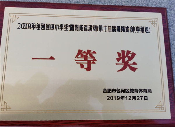 12月27日,在包河区第12届中小学跳绳比赛中,我校在竞争激烈的比赛中脱颖而出,以总分947分取得第一名。其中:女子集体跳163个,男子穿龙跳379个,女子穿龙跳353个,女子双人跳1380个,均荣获包河区第一名。三大项目六个组别以团体总分947.2分,高出第二名52分的优异成绩取得“团体总分第一名”,荣获包河区第12届中小学跳绳比赛一等奖。