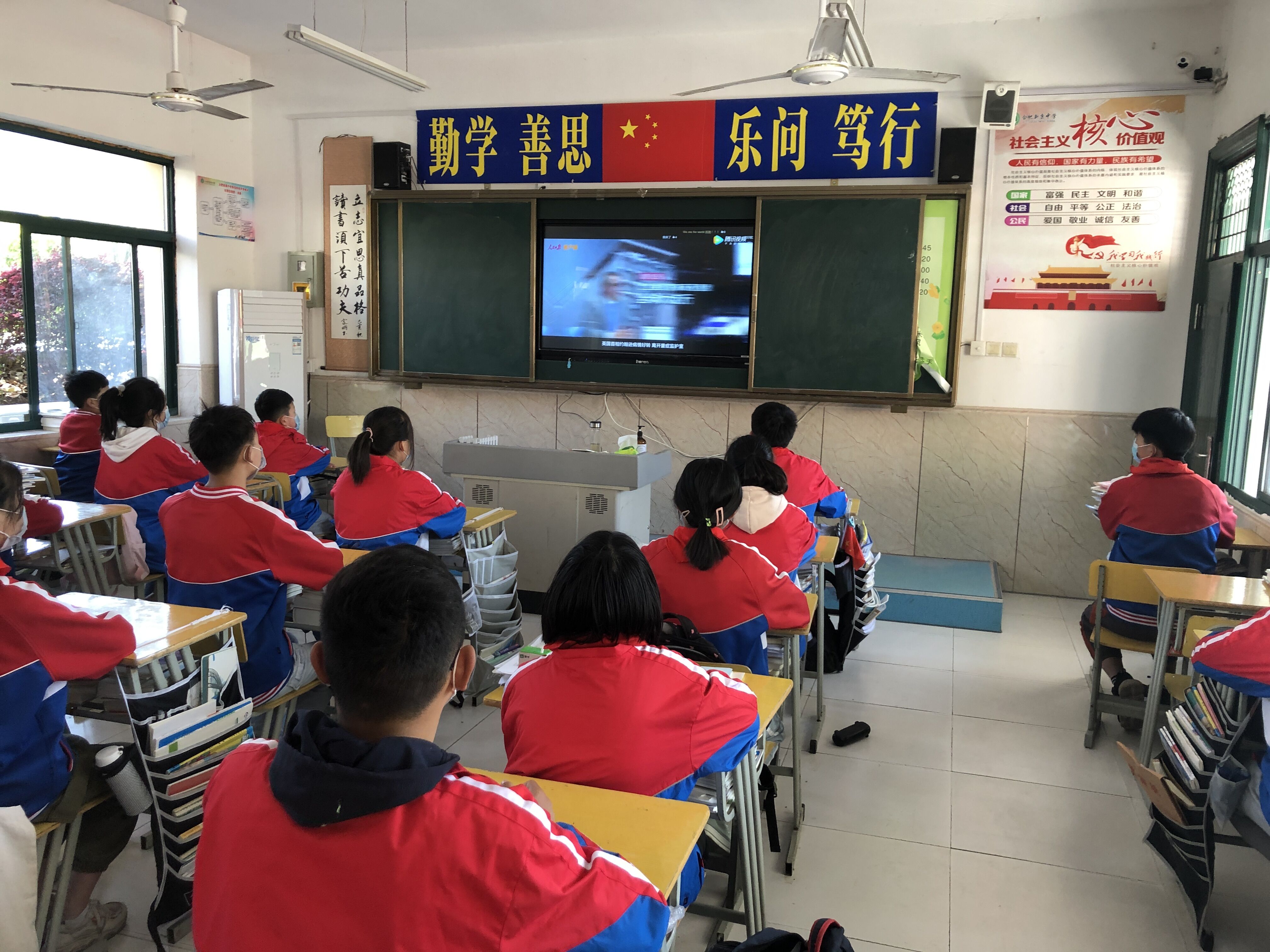 在黄英子老师的主持下,各班级利用班级多媒体举行了升旗仪式,通过视频观看五星红旗冉冉升起,全体师生肃立,高唱国歌,行注目礼。在抗疫、防疫的特殊时期,党和政府全力应对疫情,全国上下团结一心,让疫情得到有效控制,这次防控战役让我们深刻体会到祖国强大力量,看到五星红旗升起,爱国情、自豪感油然而生。