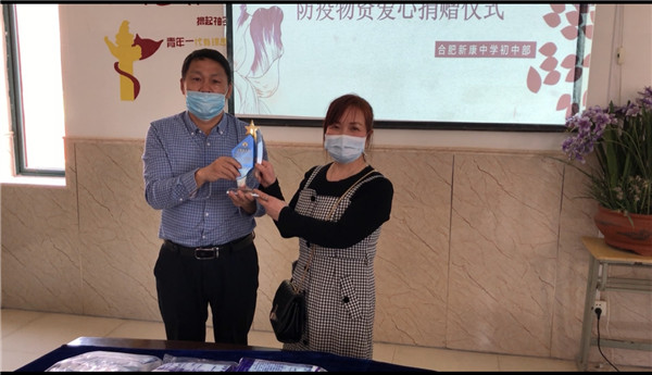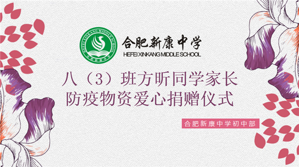 2020年4月26日,合肥新康中学初中部在一楼会议室举办了八(3)班方昕家长的爱心捐赠仪式,出席此次仪式的有合肥新康中学初中部校长徐学法,副校长李森,副校长龚红卫,方昕家长以及班主任唐文君老师。本次仪式由李森副校长主持。
