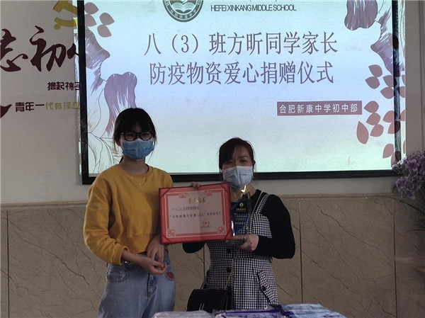 为了孩子们复学工作的正常进行,方昕家长以个人名义为学校捐赠防疫物资:一次性医用口罩3000个,免洗手液40瓶,84消毒液10桶共50Kg。捐赠仪式上,徐学法校长致辞,他首先代表合肥新康中学的全体师生向家长的壮举表示感谢,这不仅仅为我校疫情防控工作助力,更体现家长对八(3)班全体老师和学校工作的认可,同时也体现出方昕家长心系新康,服务社会的高度责任感。