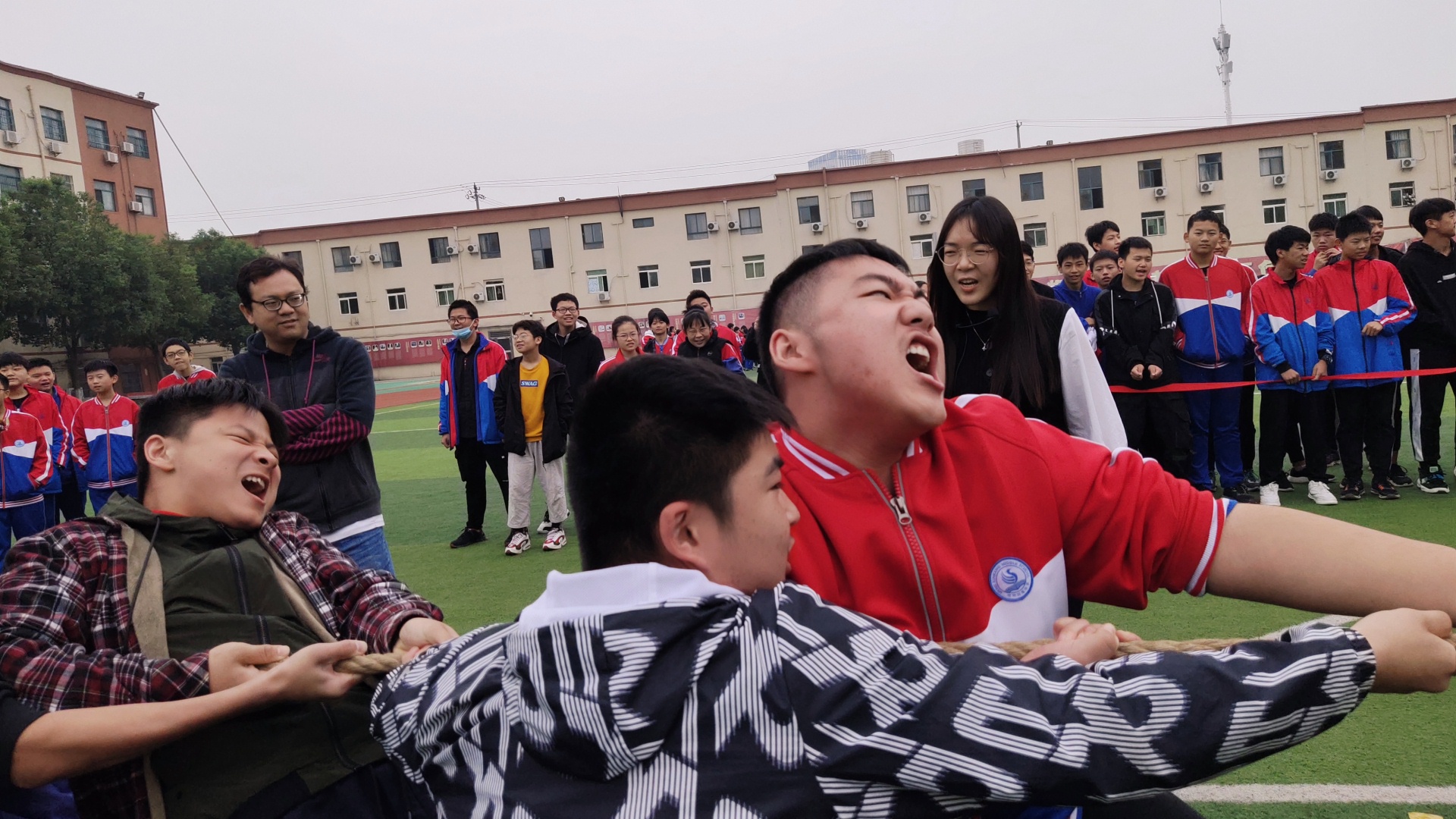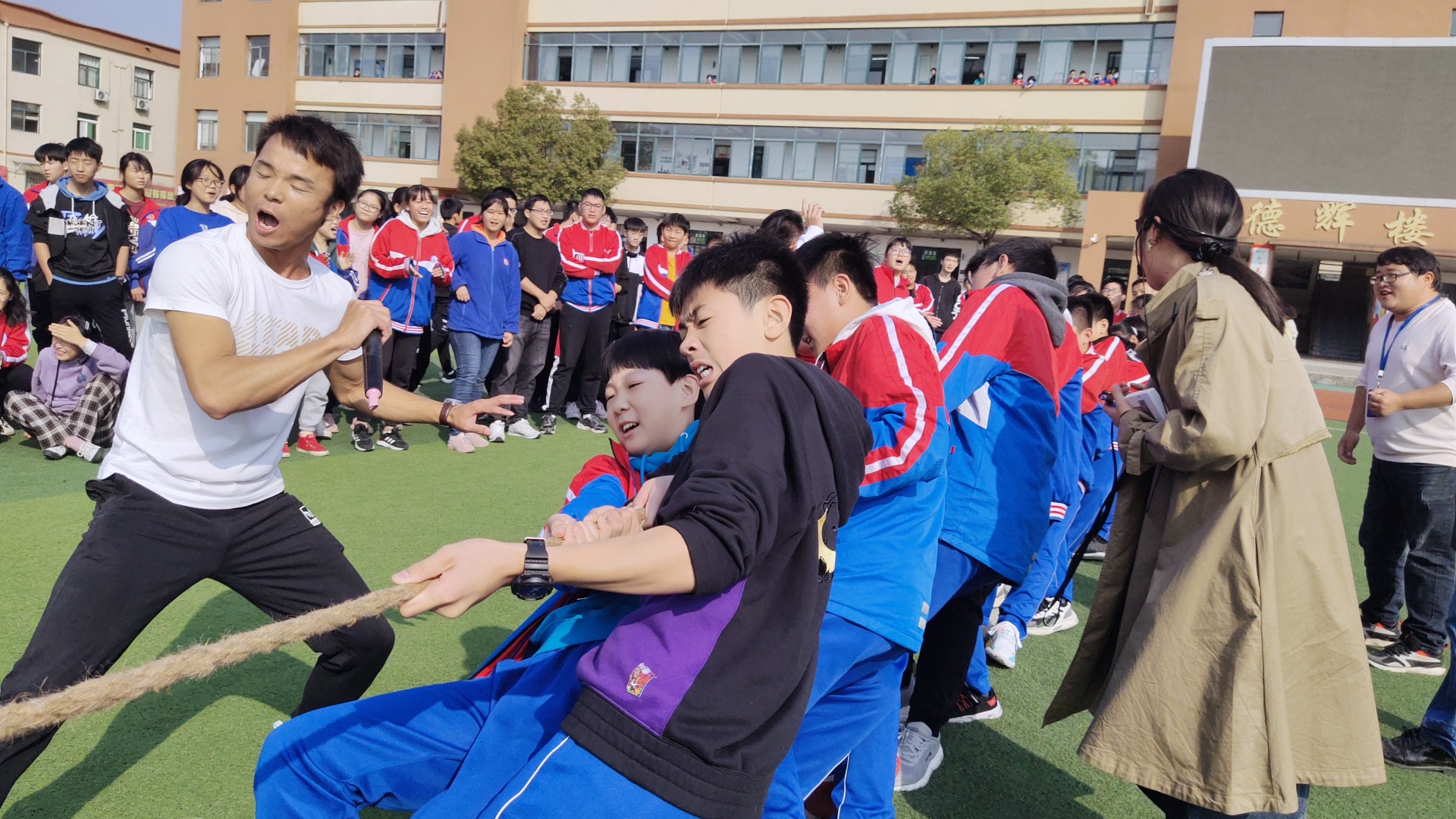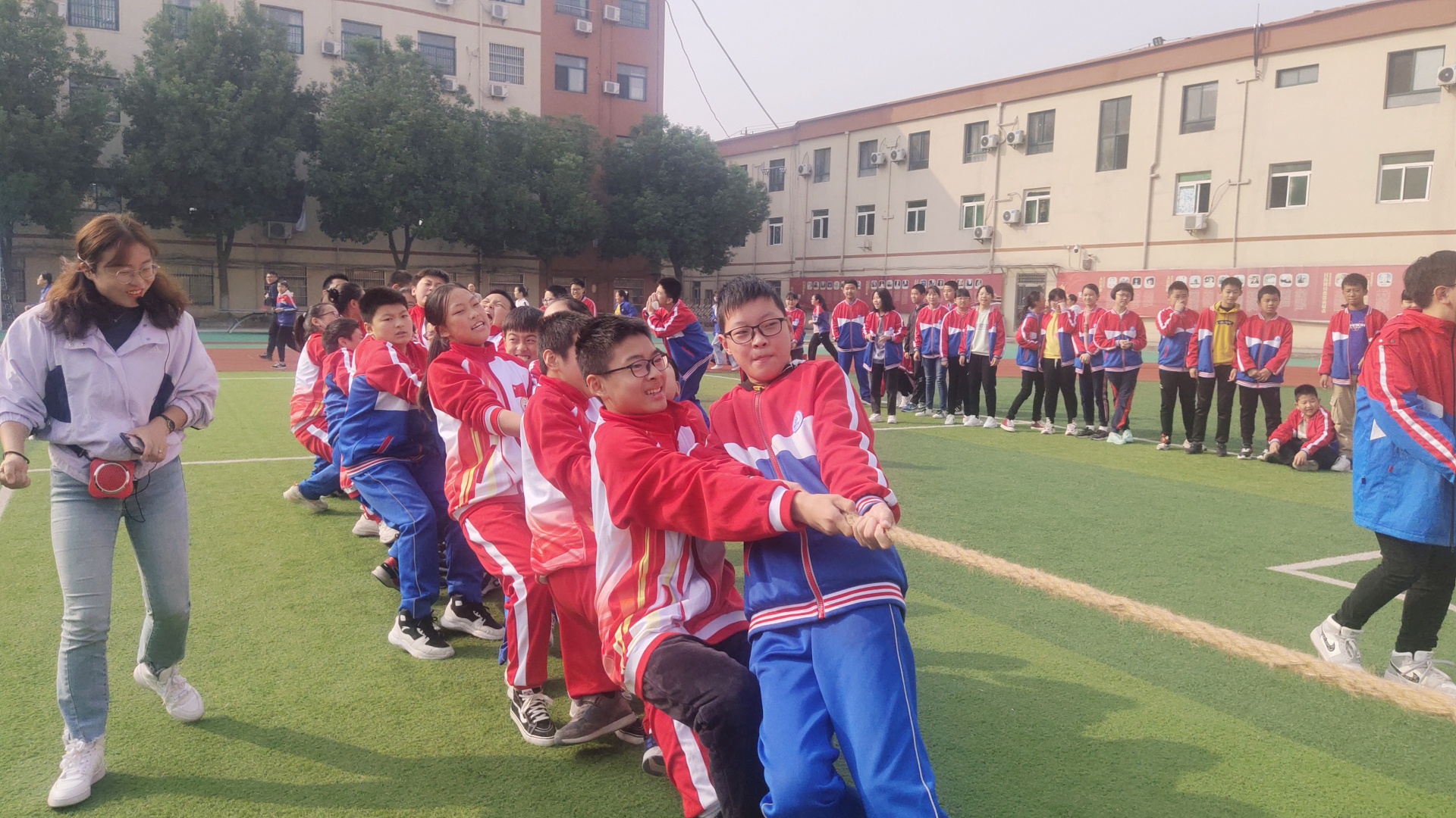 赛场上,各班早已陈兵列阵,摩拳擦掌,跃跃欲试。当比赛的哨声响起,只见参赛的队员们紧握长绳,铆足了劲拼命往后拉!一根长长的拔河绳,凝聚着竞赛双方的勇气、智慧和力量,承载着初中部的激情、自信和活力。交战双方稳扎马步,摆好阵势,一声令下,双方立刻展开“厮杀”,赛场上顿时人声鼎沸,喊声震天。这是一场团队精神的比拼,为了集体荣誉,各方势如猛虎,寸土必争,赛场气氛热烈活跃。观众紧握拳头,齐声助威,震耳欲聋,激情拥抱了深秋的微冷。