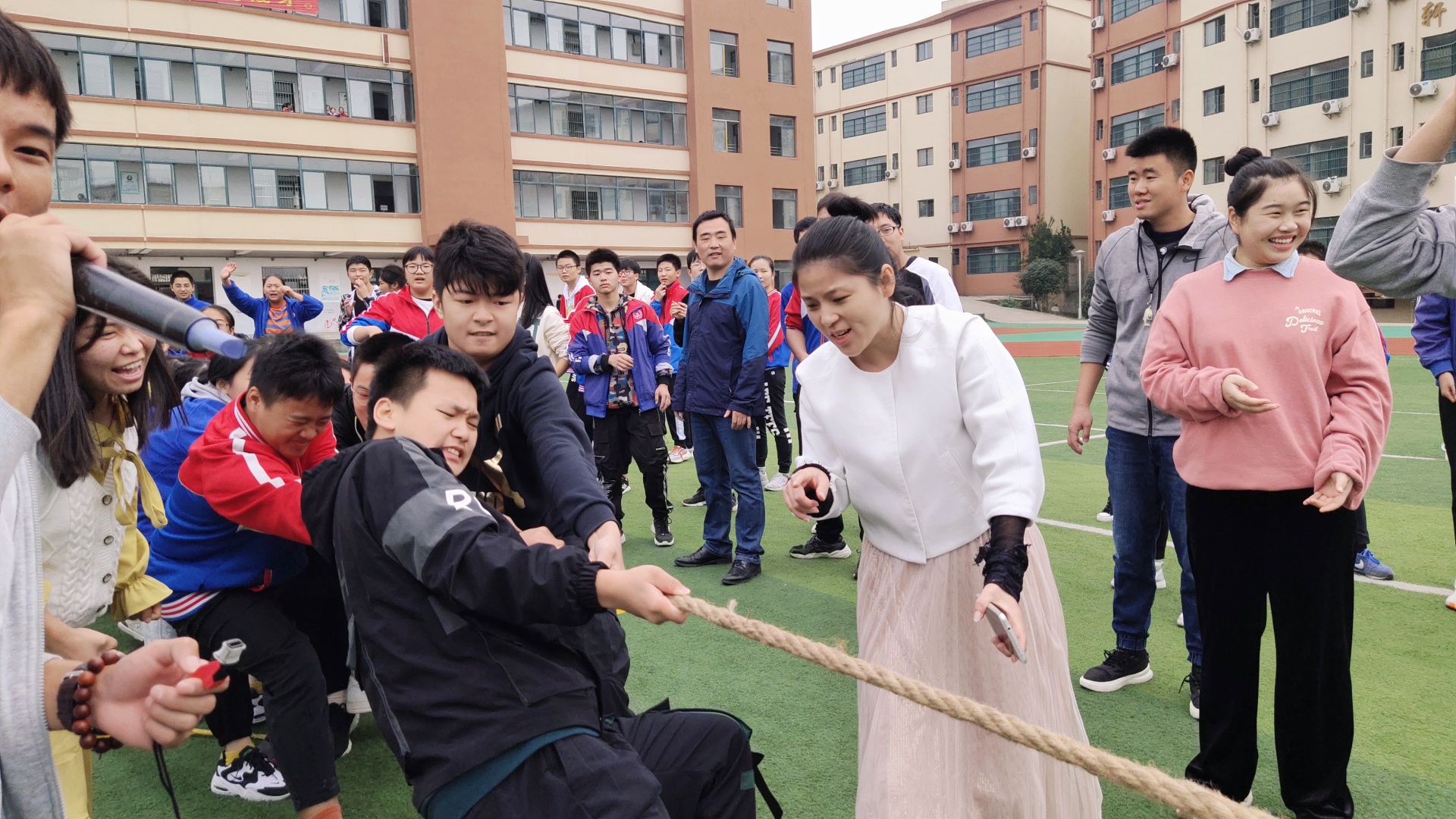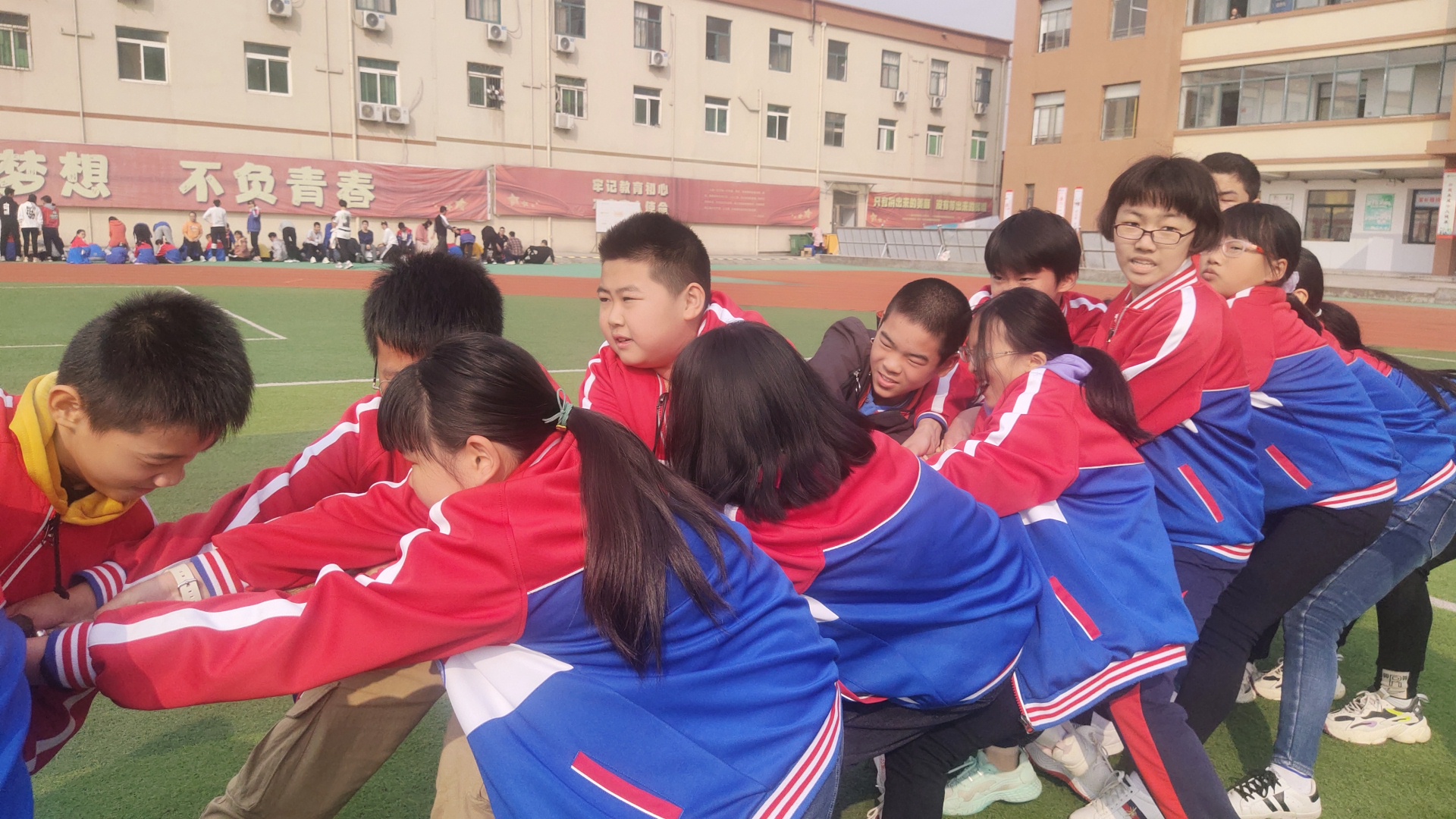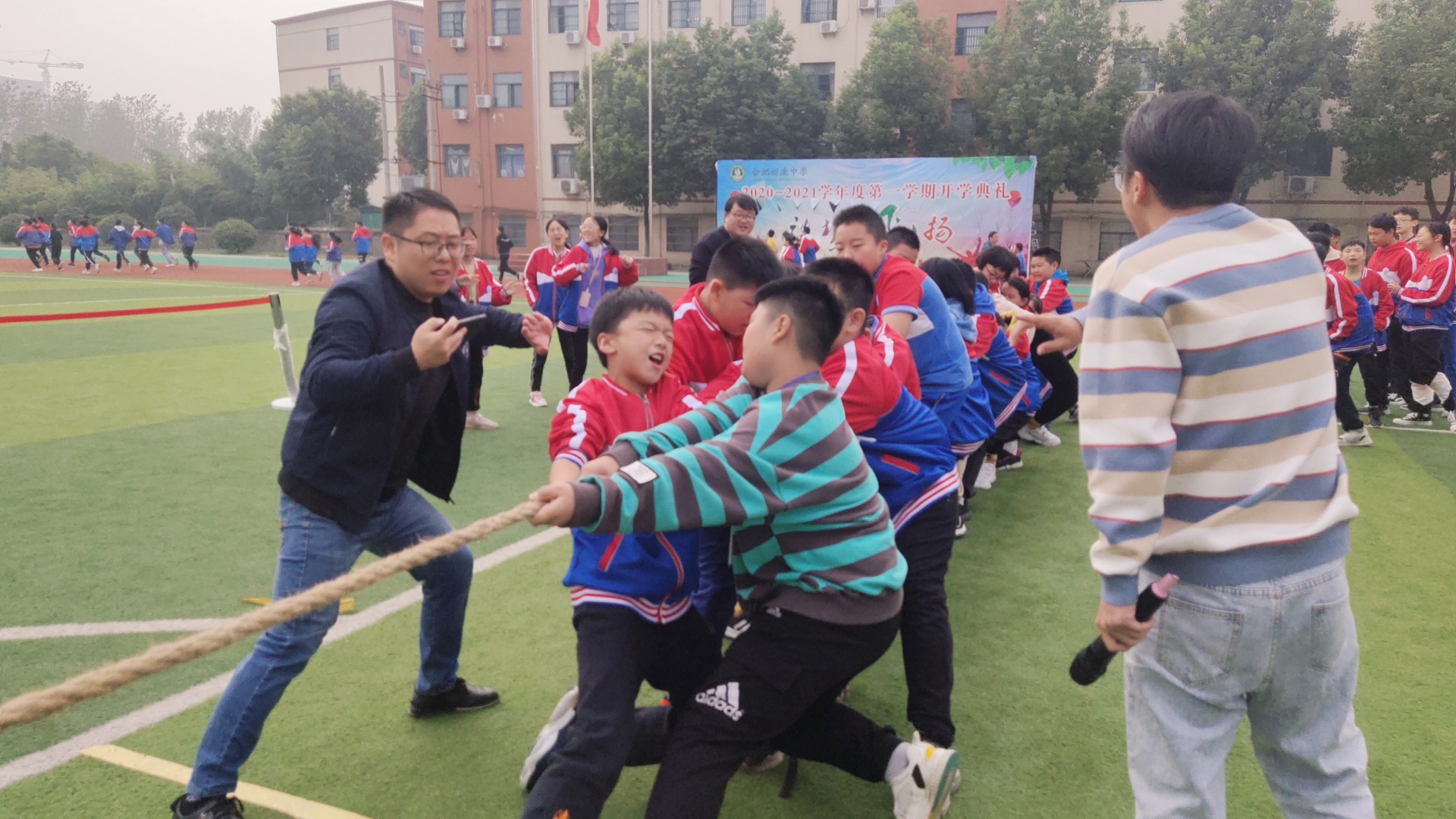 赛场上,各班早已陈兵列阵,摩拳擦掌,跃跃欲试。当比赛的哨声响起,只见参赛的队员们紧握长绳,铆足了劲拼命往后拉!一根长长的拔河绳,凝聚着竞赛双方的勇气、智慧和力量,承载着初中部的激情、自信和活力。交战双方稳扎马步,摆好阵势,一声令下,双方立刻展开“厮杀”,赛场上顿时人声鼎沸,喊声震天。这是一场团队精神的比拼,为了集体荣誉,各方势如猛虎,寸土必争,赛场气氛热烈活跃。观众紧握拳头,齐声助威,震耳欲聋,激情拥抱了深秋的微冷。