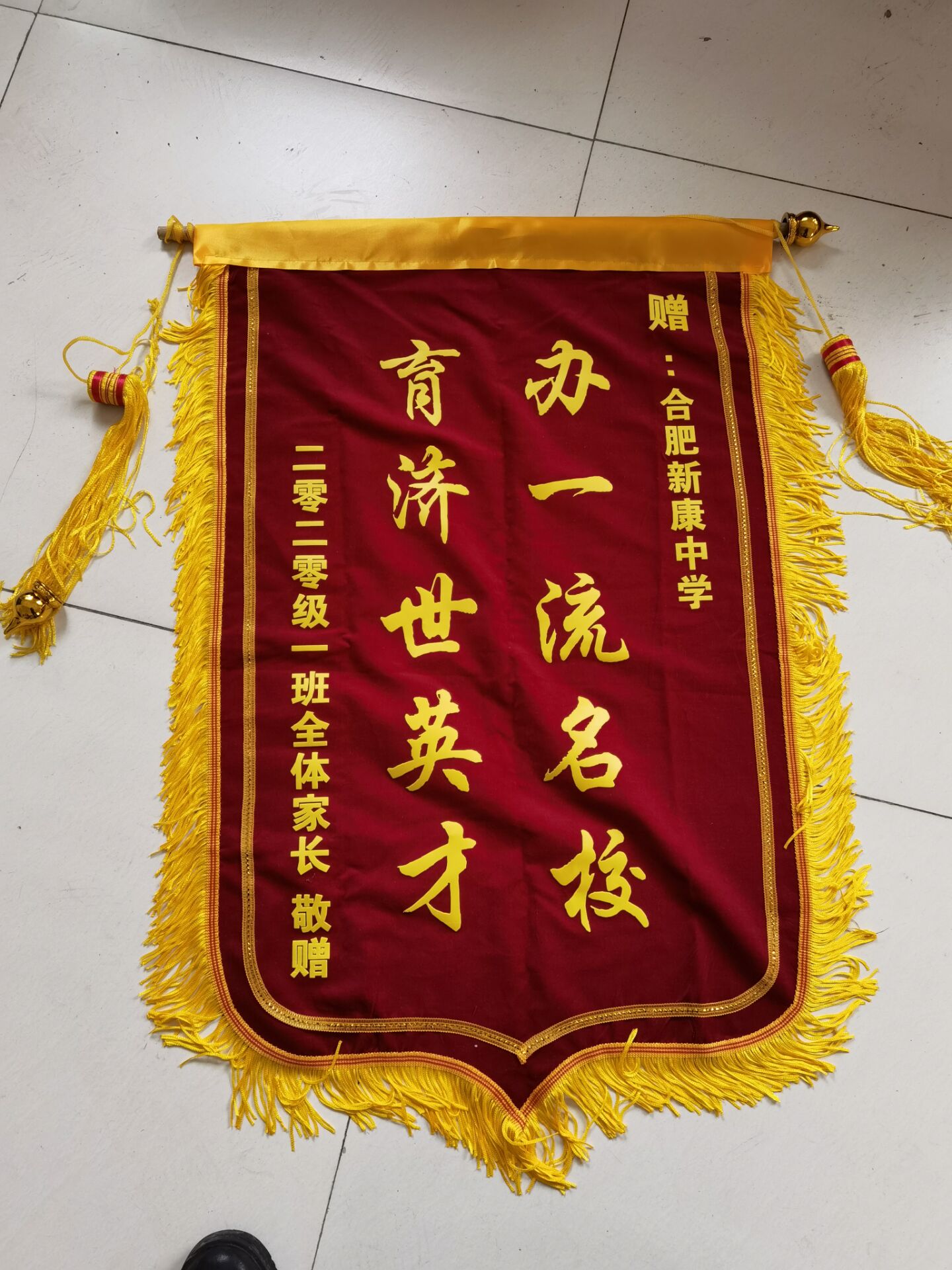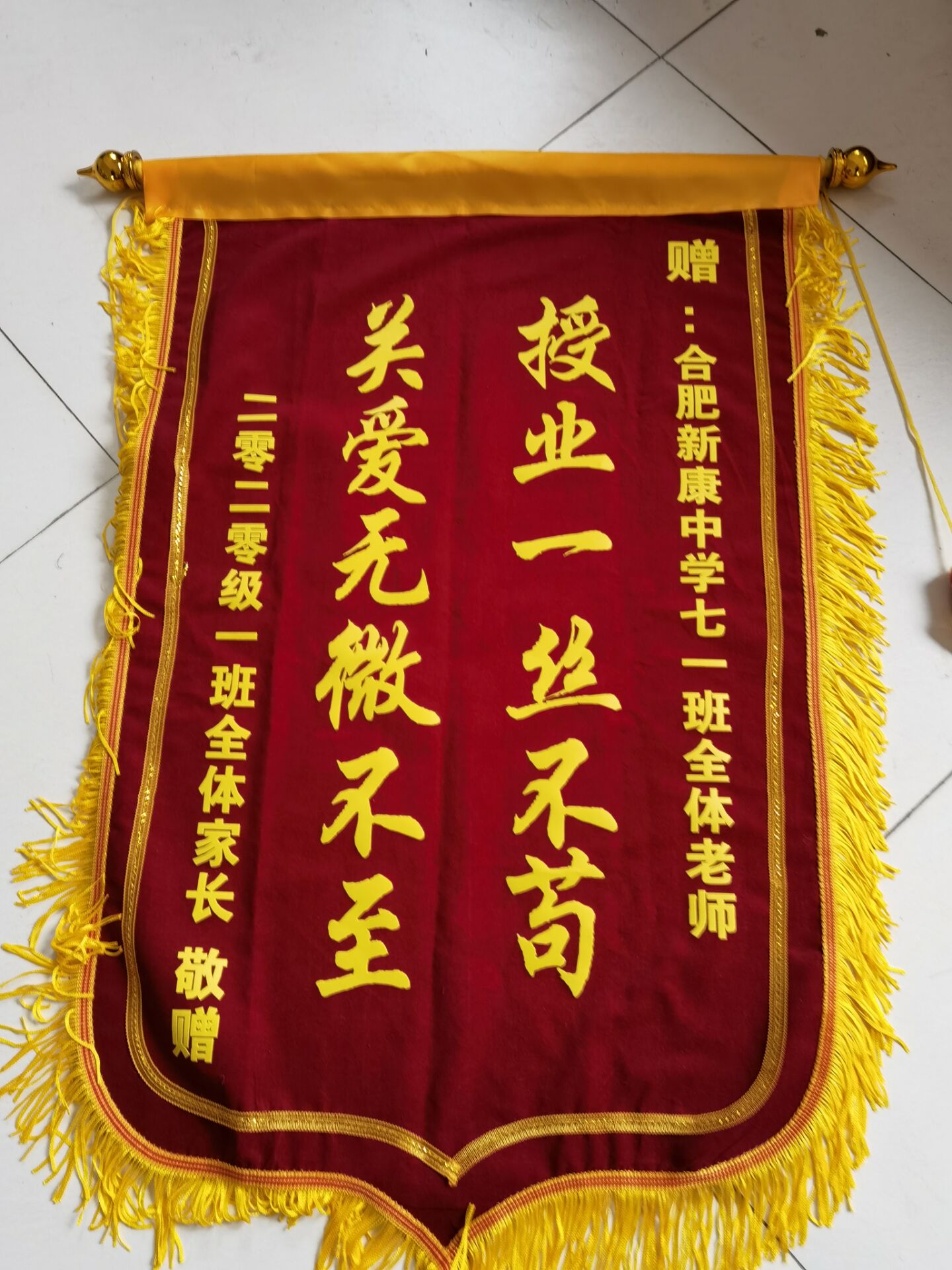 2021年1月21日,七(1)班家长代表分别将绣有“办一流名校、育济世英才”和“授业一丝不苟、关爱无微不至”字样的两面锦旗送给主任王琪老师,借此感谢七(1)班全体老师对孩子的辛勤培养和用心付出。