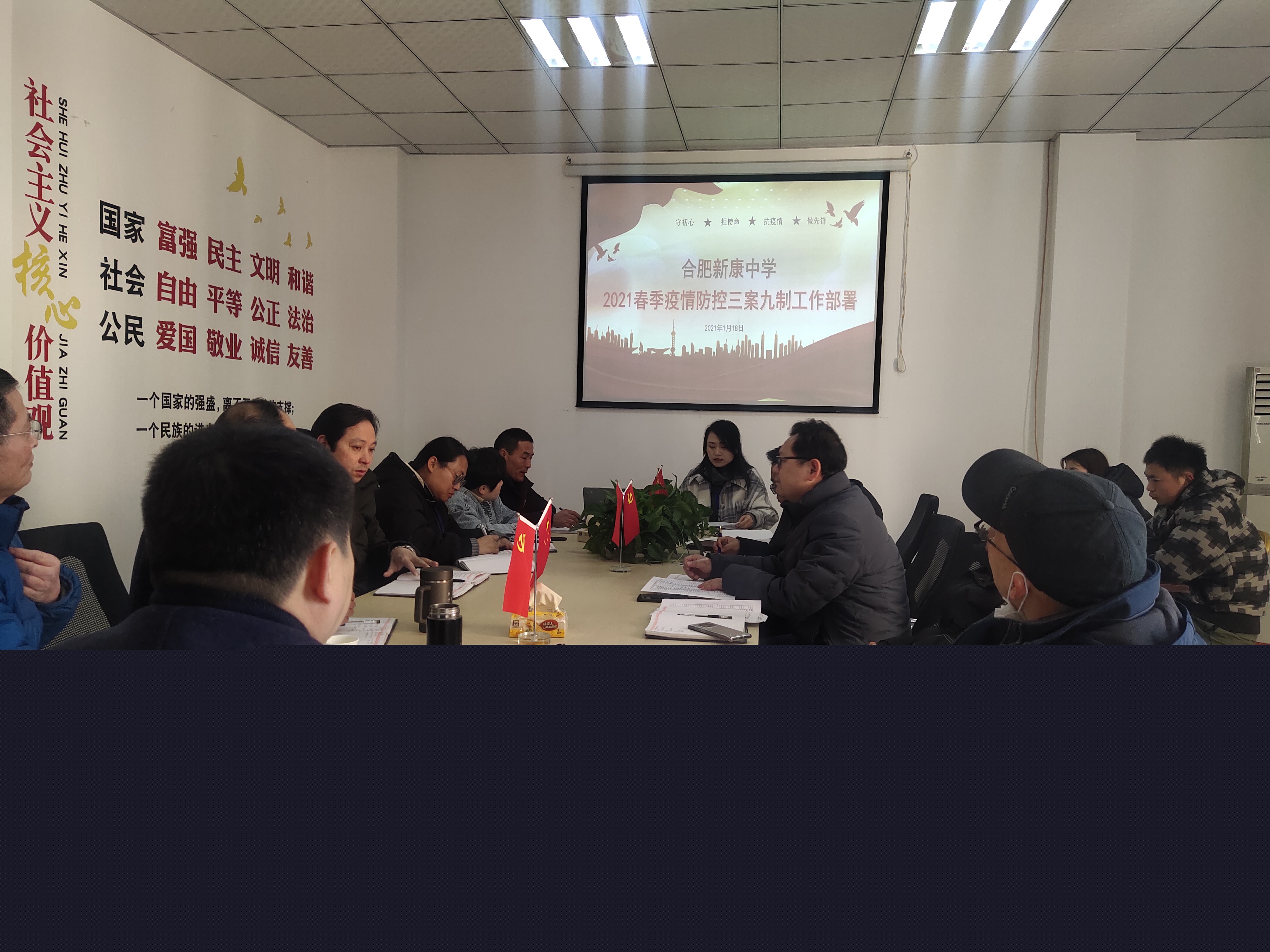 新冠肺炎疫情在境内外不断蔓延,形势严峻。为扎实做好春节寒假期间和下学期开学疫情防控有效衔接,合肥新康中学于1月18日专门召开2021年春季疫情防控工作部署会,会议由王俊董事长主持,合肥市教育局督导顾明书记参会并做工作指导。