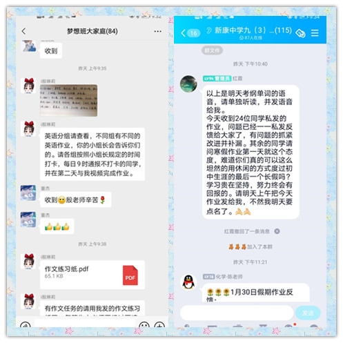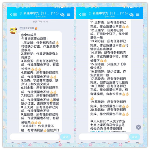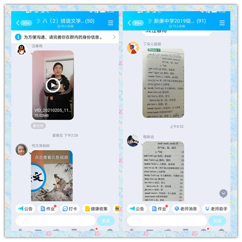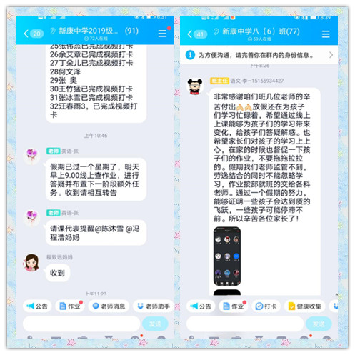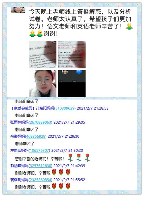教务处对此次线上作业反馈会议进行了周密部署,精心安排和全程监督。会议前,班主任和任课老师提前协商时间,在家校群里进行通知。所有老师按照通知时间,进行视频会议,在线讲解题目。现场随机抽查作业,随机提问,检查单词、古诗文背诵情况。本次作业检查,形式新颖多样,达到了预期的作业反馈和假期提醒的目的,所有家长与孩子,认真倾听,及时交流。