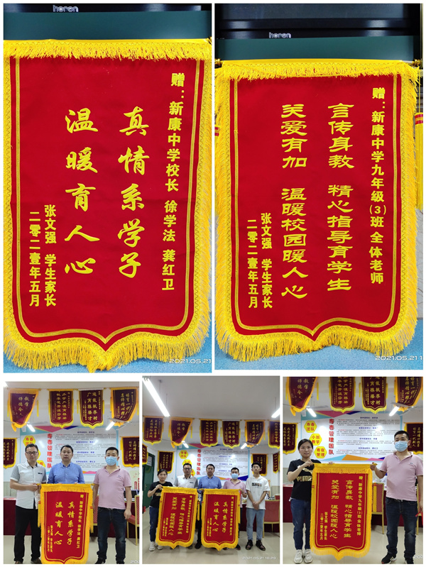 金杯银杯不如家长的口碑,学校的发展离不开家长的认可和社会的评价,5月21日下午,九年级3班的张文强家长在班主任韦秀珍老师的陪同下和孩子一起向学校送来了两面锦旗。5月23日下午,八年级(4)班家委会成员陈宇和王心蕊的家长代表全体家长送来了两面锦旗。几位家长都一致表达了对学校管理的满意以及老师的辛勤付出的感激,让家长解决了在教育孩子的后顾之忧。2019年以来到目前为止合肥新康中学已收到家长送来的锦旗46面,虽然只是一个数字,但是它的背后,是家长对学校以及老师肯定的一种体现,学校将会以更加完善的管理理念,更强的工作责任和更出色的工作业绩来回报社会,用实际行动践行社会主义核心价值观。