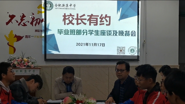 2021年11月18日下午17点50分,我校召开题为“校长有约--毕业班部分学生座谈及晚餐会”。 本次会议由龚红卫副校长主持,徐学法校长、龚红卫副校长及德育处蒋磊副主任和教务处王传伟副主任共同参与。