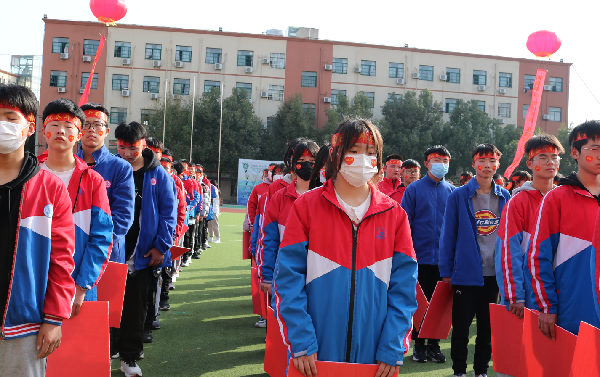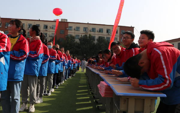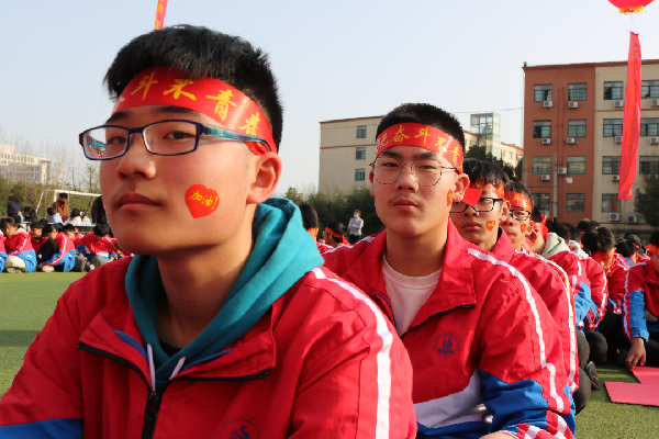 他们从老师手中接过“无奋斗,不青春”的红色发带捆绑在自己的头上。这一抹抹亮红是青春的色彩,是奋斗的色彩,这代表毕业班学子将在今后的百天,将为无悔的青春而奋斗!