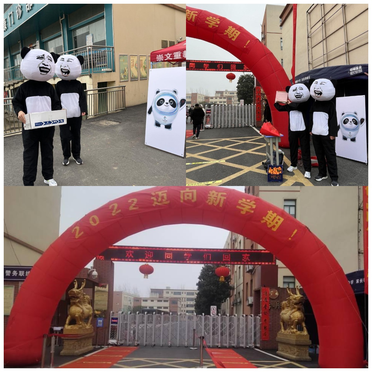 两个可爱的冰墩墩和两个挂着对联的氢气球在学校门口欢迎同学们的到来。
