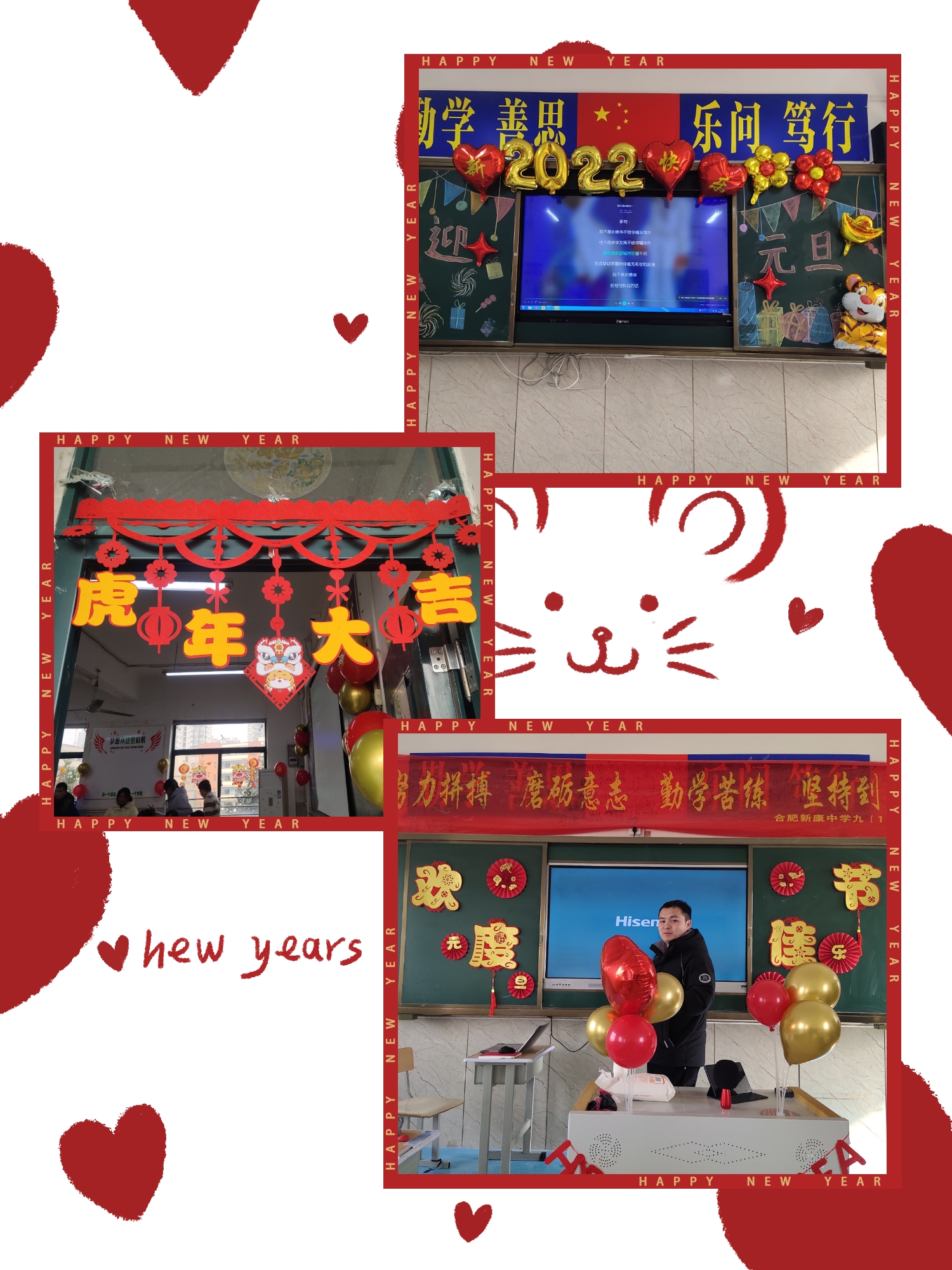 张灯结彩庆元旦,欢乐喜庆迎新年。各班都是“虎年大吉喜气迎、虎头扬扬好运来”,虎虎生威、福虎生旺、虎年大吉……这些表达期盼祝福的图画、标语贴满和挂满教室,还有各式的彩带、彩旗、五彩缤纷的气球,让整个班级充满节日的喜庆气氛。