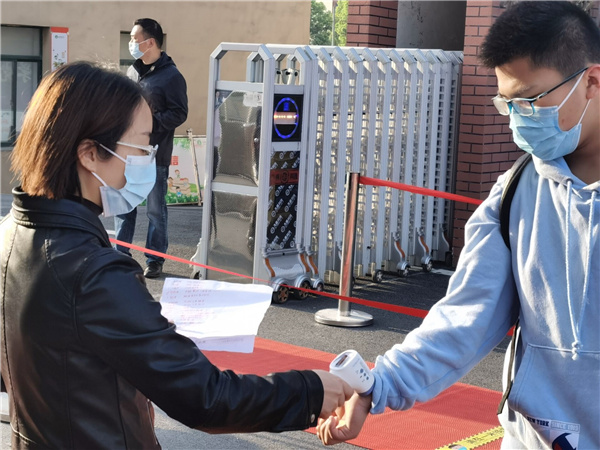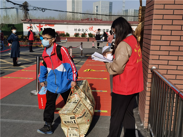 严把入校关。七八九年级学生错峰返校,严格返校程序,要求学生返校离家前再次清点物品,佩戴口罩,注意交通、财物等安全,按照对应时间段到校,学生从专属通道进行免洗消毒和测量体温,体温检测正常后方可入校。