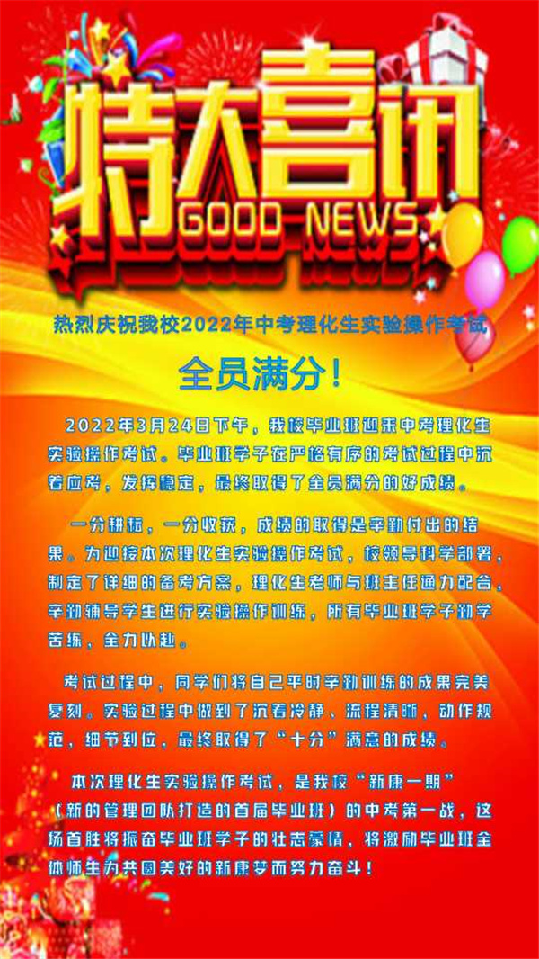 特大喜讯!热烈庆祝我校2022年中考理化生实验操作考试全员满分!