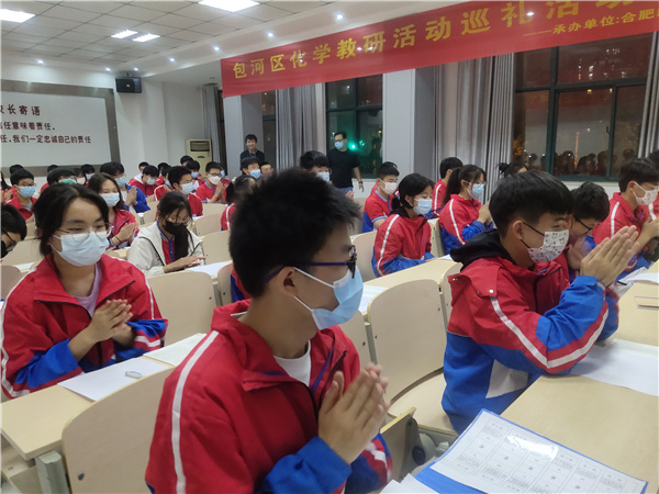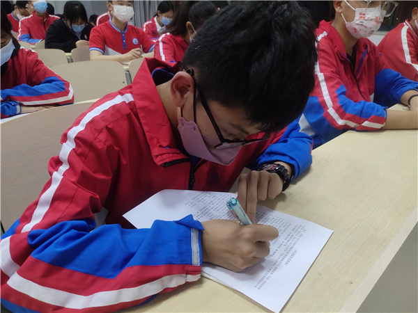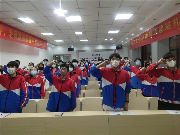 最后,在教务处王传伟主任的带领下全体九年级学生进行了集体宣誓,以鼓舞同学们的自信心。此次讲座的目的就是为紧张备考的九年级学生注入了一剂强心剂,增强了他们从容应对中考的信心。