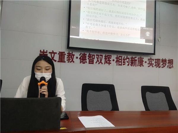 中考即将来临,毕业班紧张而繁忙的学习已到了最后的冲刺阶段,学生的学习压力越来越重、紧张的心理也越显突出。为了帮助九年级学生排解心理上的压力和困扰,让他们拥有健康自信的考前心态,5月15日晚,我校开展了毕业班学生心理辅导讲座。由我校心理咨询室的国家三级心理咨询师翁紫云老师为学生送来了一场题为《减压助力、笑迎中考》的讲座。全体九年级学生参加,活动以两个班级为代表在校会议室现场参与,其他班级利用腾讯会议在班级观看直播。