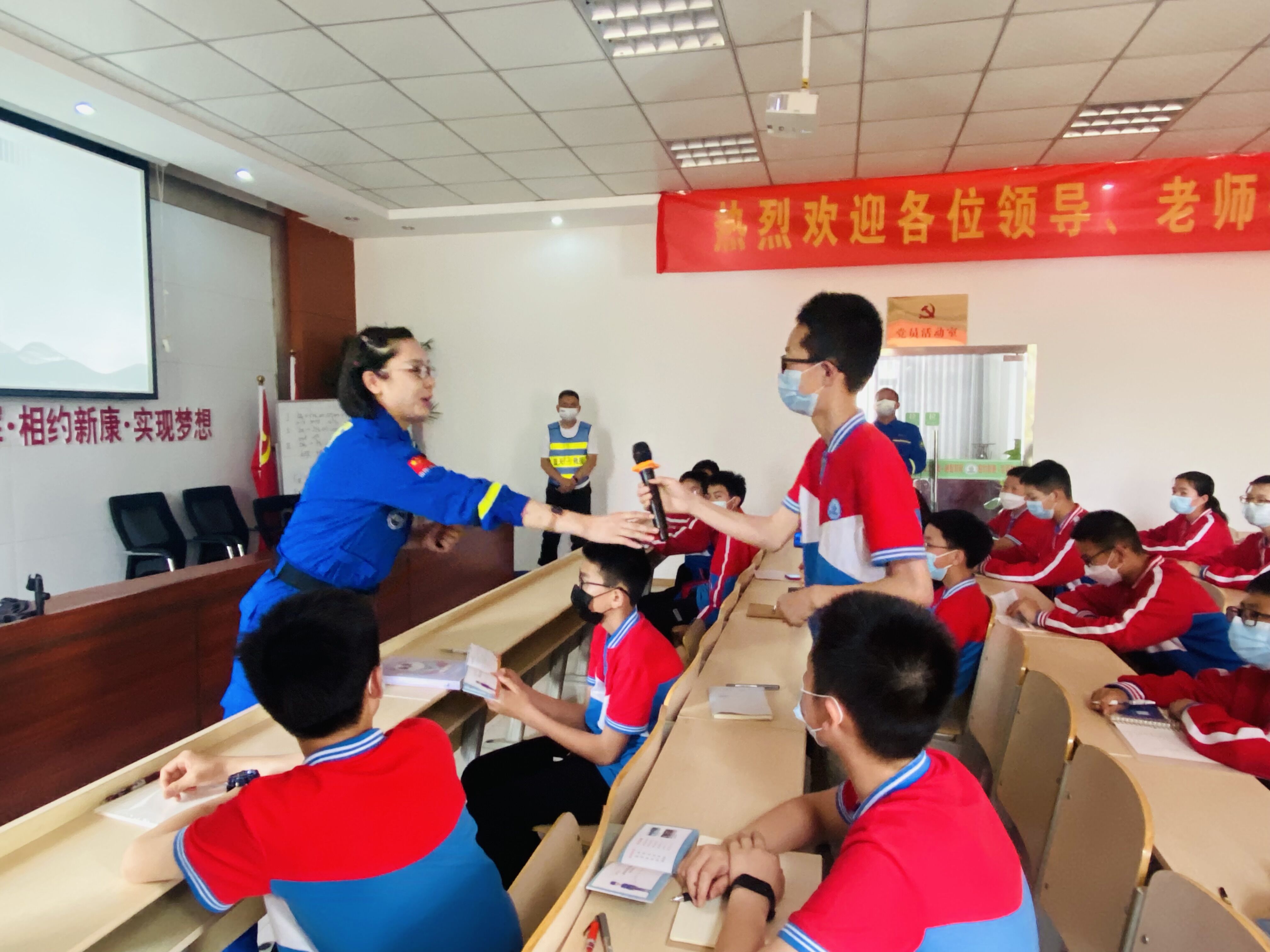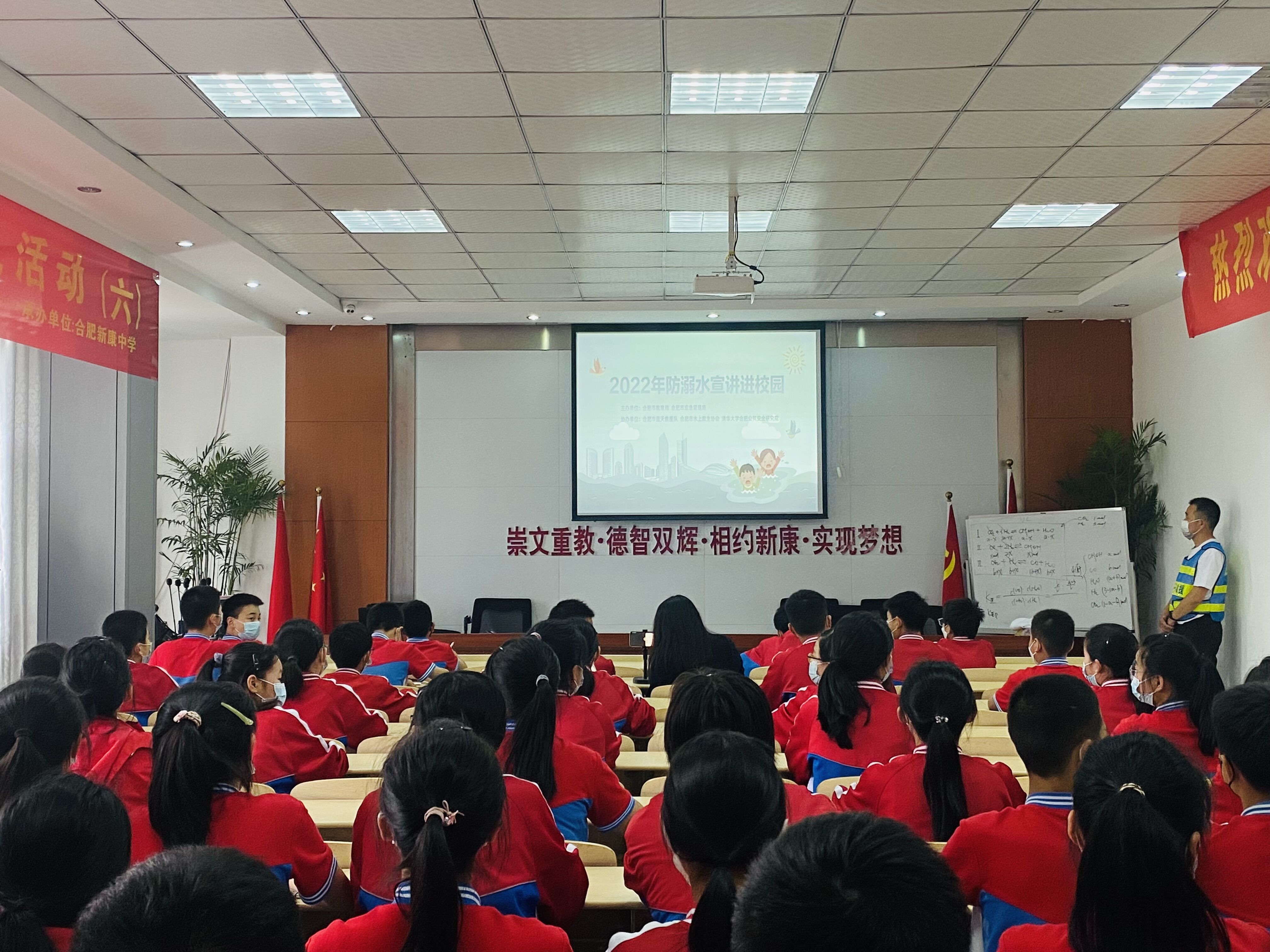 为切实加强学生防溺水安全教育,提高学生防溺水意识和自救自护能力,有效防止溺水事故的发生,5月26日下午,合肥市蓝天救援队的几位警官走进我校,开展了防溺水安全知识宣讲教育活动。为落实防疫要求减少人员聚集,学校安排两个班级在会场进行现场观看,其余学生利用腾讯会议在班级观看直播。