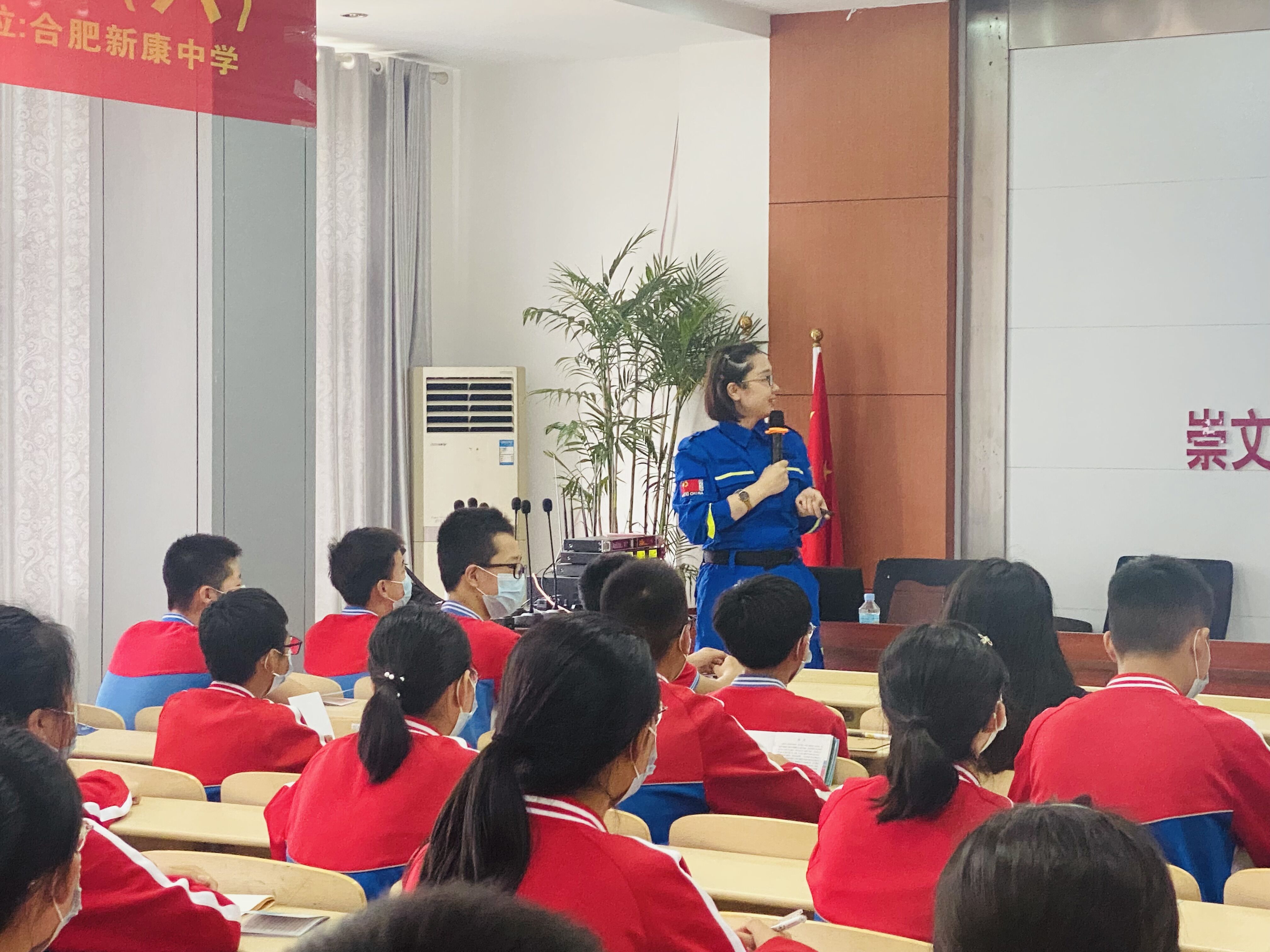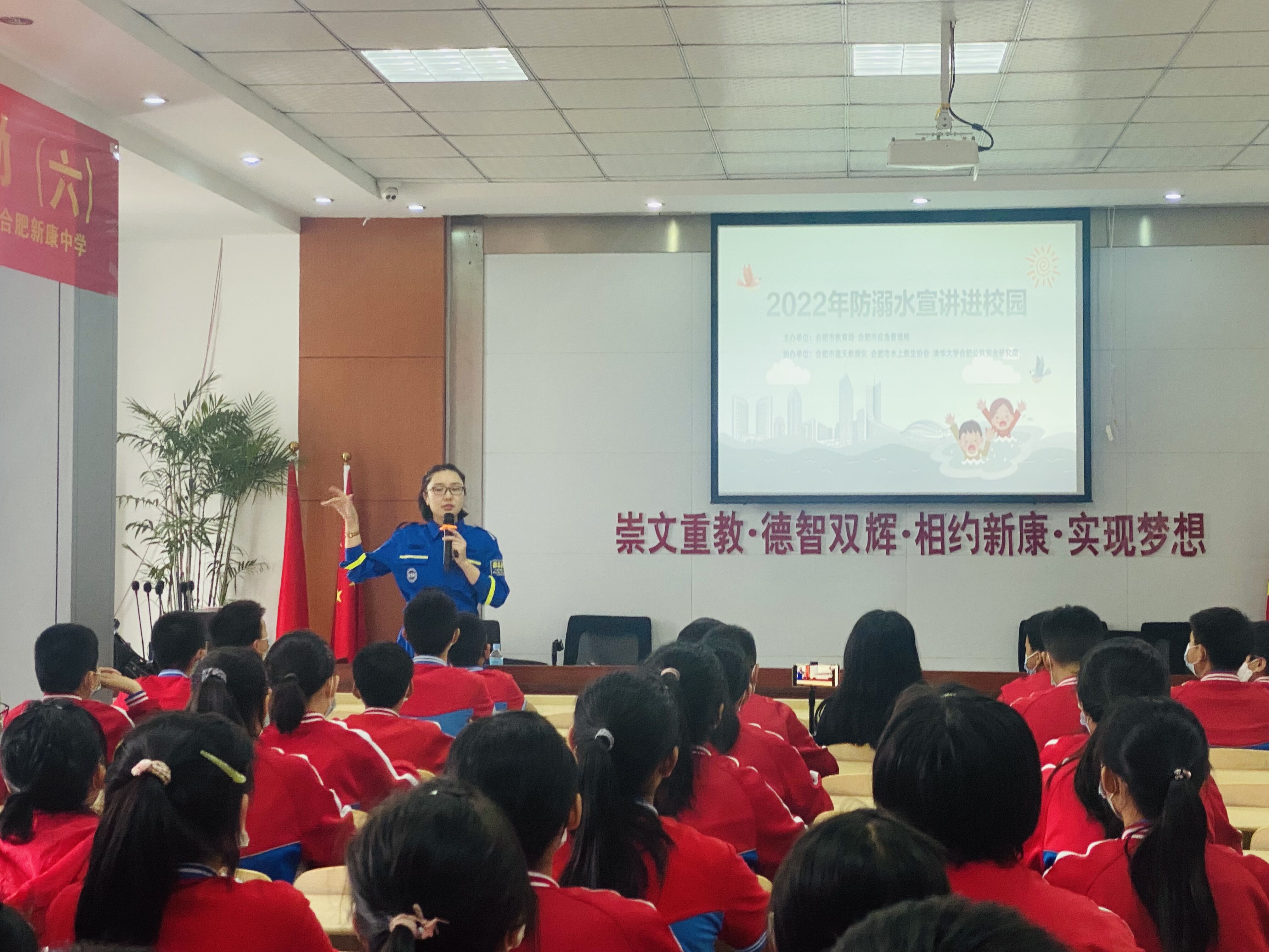 合肥市蓝天救援队的吴警官结合近年来发生的学生溺亡事件,引起学生对溺水危险的重视,进而向同学们宣讲溺水救援知识,演示落水后的正确救援方法。