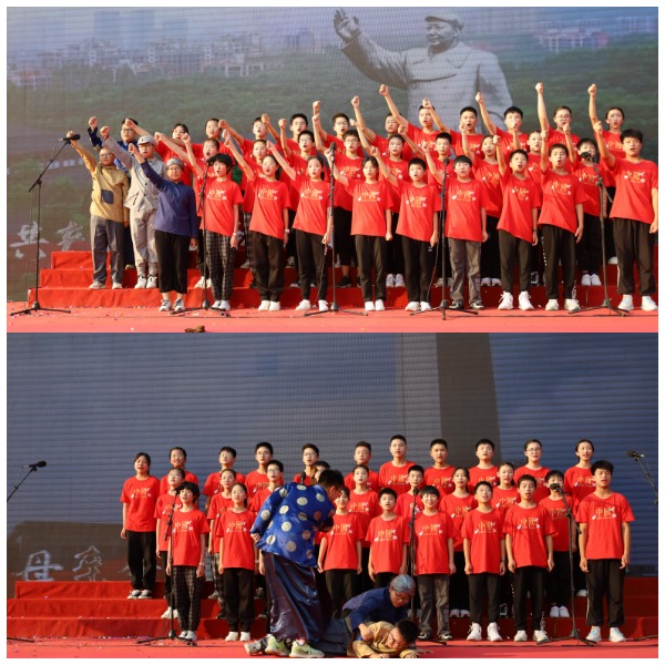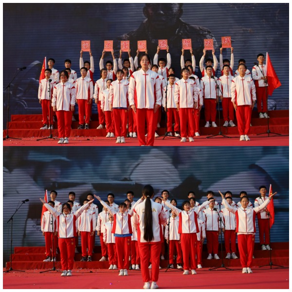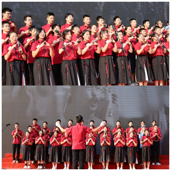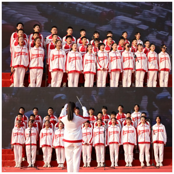 舞台上,同学们慷慨激昂、意气风发,用一首首催人奋进的颂歌,述说着热血少年们的爱国情、报国志。而手中的小红旗的挥舞,汇成了一片红色的海洋。九年级学生演唱的《孤勇者》 、 音乐老师胡智迪老师演唱的《海阔天空》 ,政史组与语文组老师的诗歌朗诵《祖国我的心之所向》 ,是歌咏比赛最出彩的点缀。全体教师最后的大合唱《歌唱祖国》 将整个活动推向了高潮。