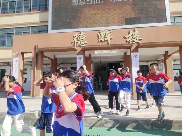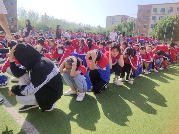 上午9时18分,校园内警报齐鸣,按先后顺序进行了预先警报、空袭警报、解除警报三种防空警报信号的演练,随着预先警报的信号响起,各班学生在班主任的引导下,以最快的速度从教学楼撤出,一边用双手护住头部,一边按照指定路线有序向学校操场疏散,急速到达指定安全区域集结。警报解除后,各班级进行清点学生人数,并层层向上汇报。