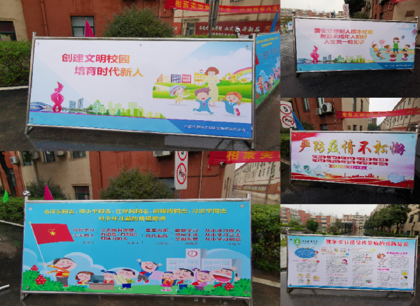 在徐校长、龚校长的组织下,教师们对校门口进行安全防控布置,摆放各类疫情防控提示展板和各类防控物品。校门口标着“新学期、新起点、新希望”的彩虹门及两个氢气球为同学们的到来营造了喜庆的气氛。两个巨大的遮雨棚方便家长们与老师交流,办理入学手续。在门口的马路上,老师们在道路不同的位置,现场维持交通秩序,保证学校门口畅通无阻。