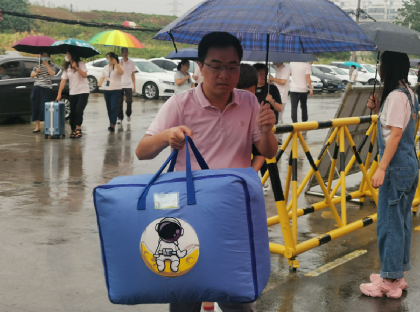 七点半左右,家长和同学们陆续到来,他们还没有下车,就有老师到他们车前帮他们搬运行李。随后同学们从专属通道进入校门,有专门的老师给他们测量体温,进行手部和行李消毒。消毒完成后,立即有老师来帮助学生搬运行李送至宿舍。因为家长们不能入校,宿舍的生活老师就帮助同学们叠被子和整理内务。此时虽下着雨,但在老师们的帮助下,同学们都安全顺利入校,整个过程无论是同学们,还是家长们都感到安心和舒心。